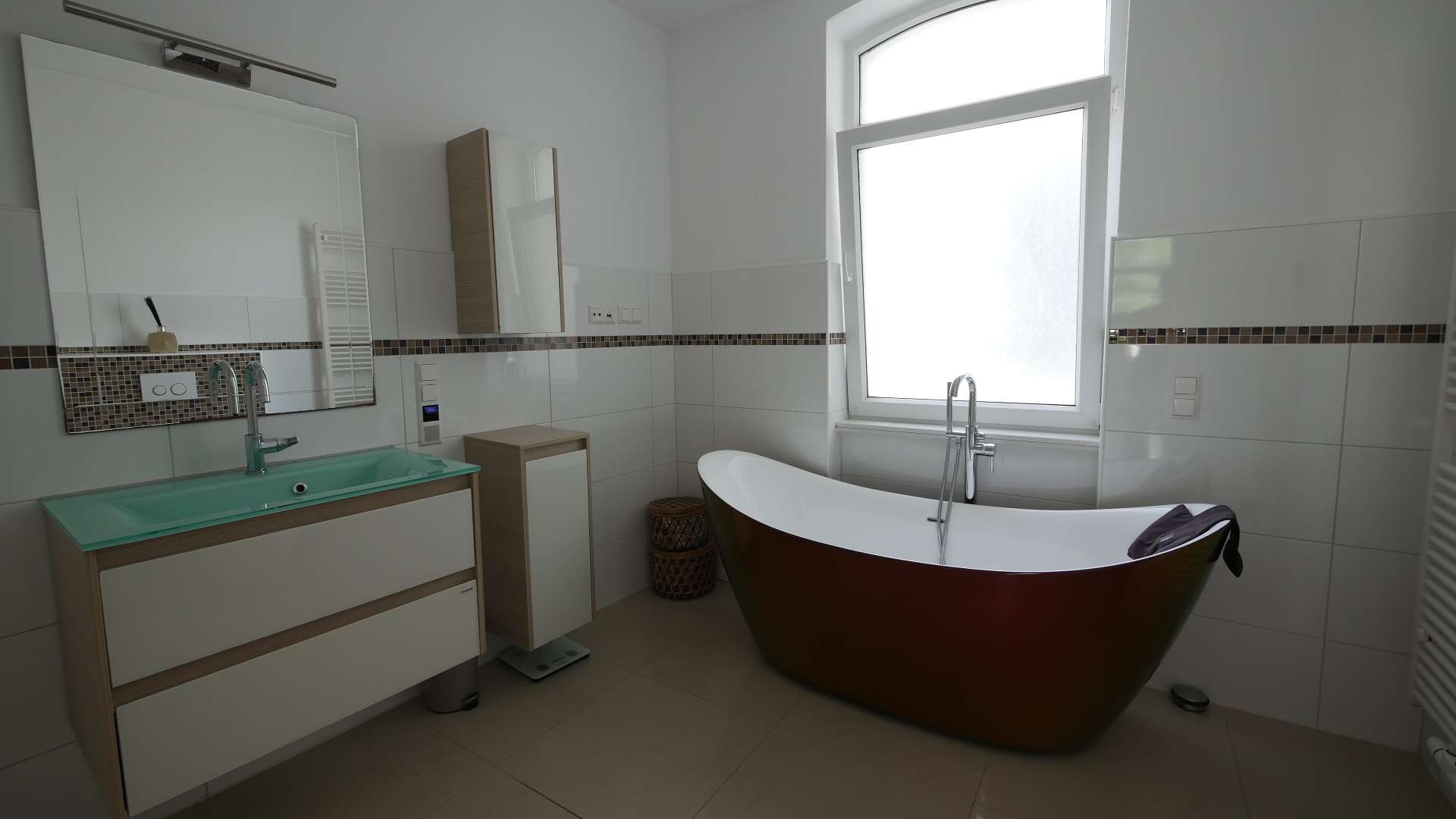 Das Tageslichtbad überzeugt mit einer stilvollen Badewanne, einer bodengleichen Dusche und einer modernen Ausstattung.