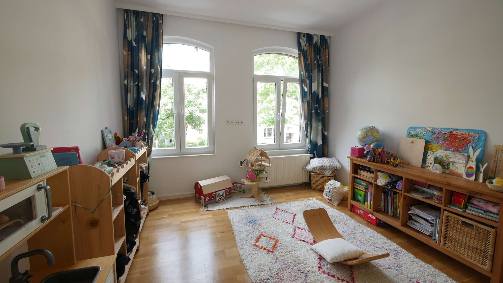 Die Wohnung verfügt über insgesamt vier Zimmer, darunter ein geräumiges Schlafzimmer und einen weiteren individuell nutzbaren Raum – ideal als Kinderzimmer, Arbeitszimmer oder Gästezimmer. Das vierte Zimmer ist mit einem Schreibtisch und einem großen Einbaukleiderschrank eingerichtet.