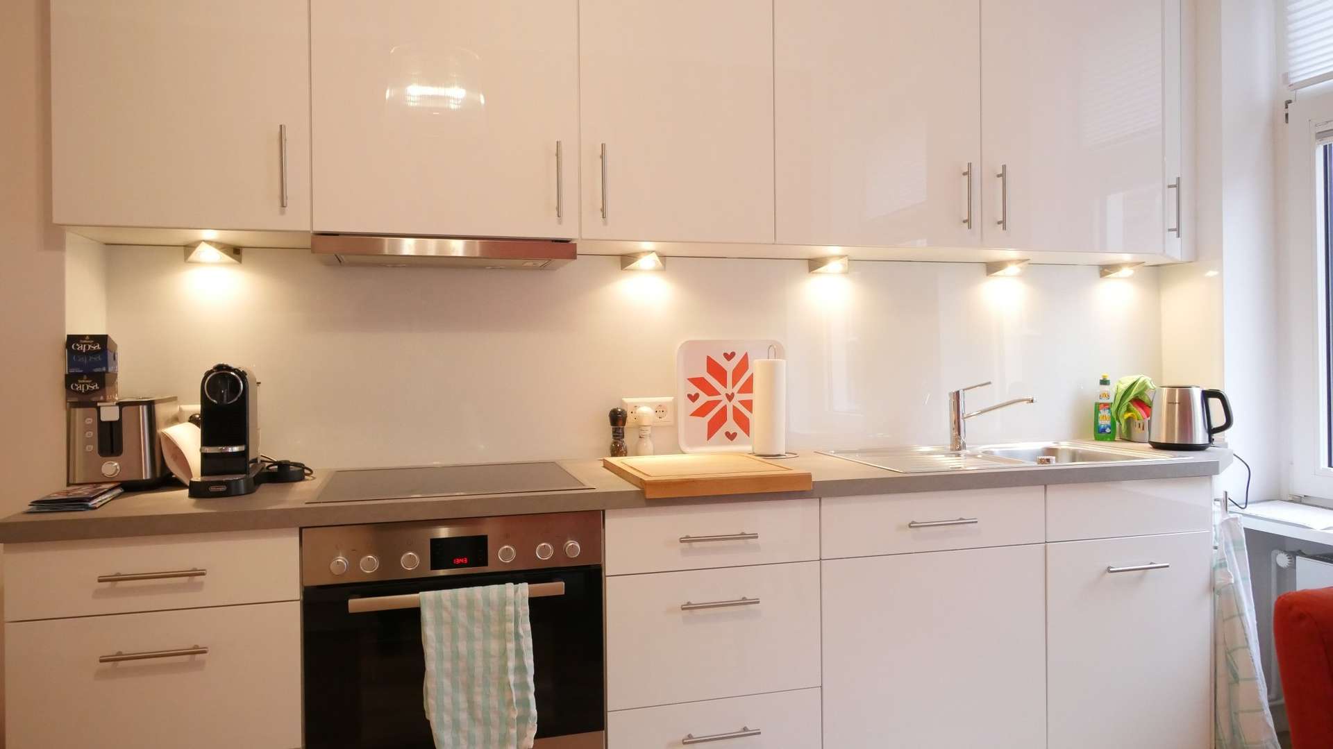 Die große Wohn-/Essküche ist mit einer modernen, weißen Einbauküche in Lackoptik eingerichtet. Die Einbauküche verfügt über einen Geschirrspüler, Herd mit Ceranfeld, großer Kühlschrank und ausreichend Stauraum für Küchenutensilien. In der Küche befindet sich ein großer Esstisch mit Ausziehfunktion und Stühlen.