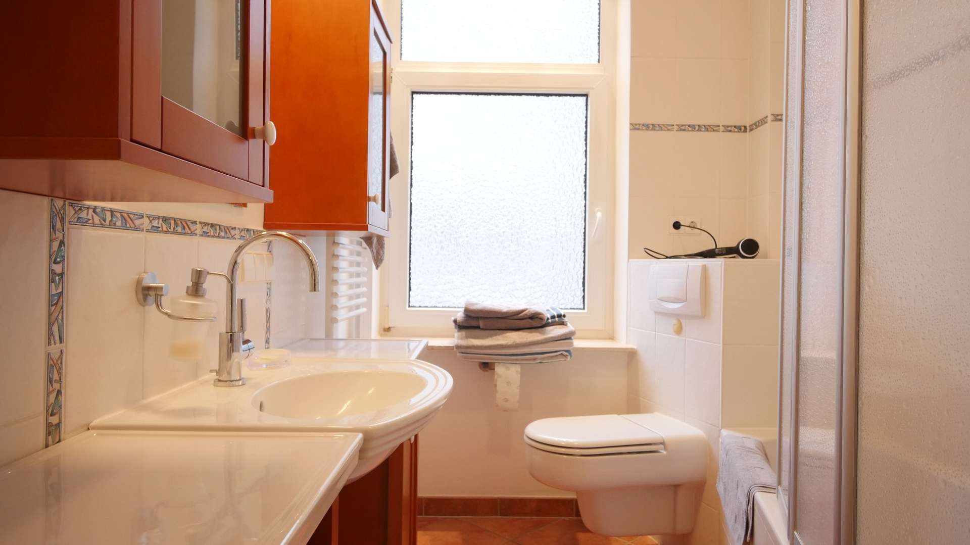Das hell geflieste Badezimmer mit Terracottafussboden ist wunderschön passend zur Wohnung saniert worden und ist mit hochwertigen Objekten und Armaturen ausgestattet. Im Badezimmer befindet sich hinter der Tür versteckt die Waschmaschine.