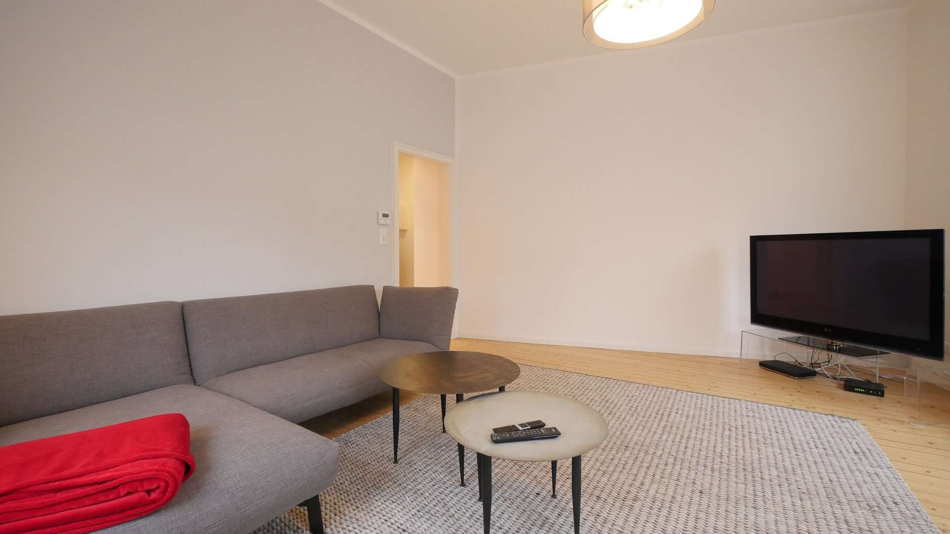 Im Wohnzimmer befindet sich ein modernes Sofa mit Beistelltisch, großem TV-Gerät, hochwertigem Teppich auf Dielenboden.