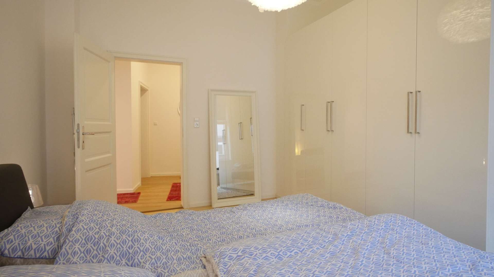 Das Schlafzimmer ist mit einem Doppelbett (180cm x 200cm) und großem Schlafzimmerschrank eingerichtet.