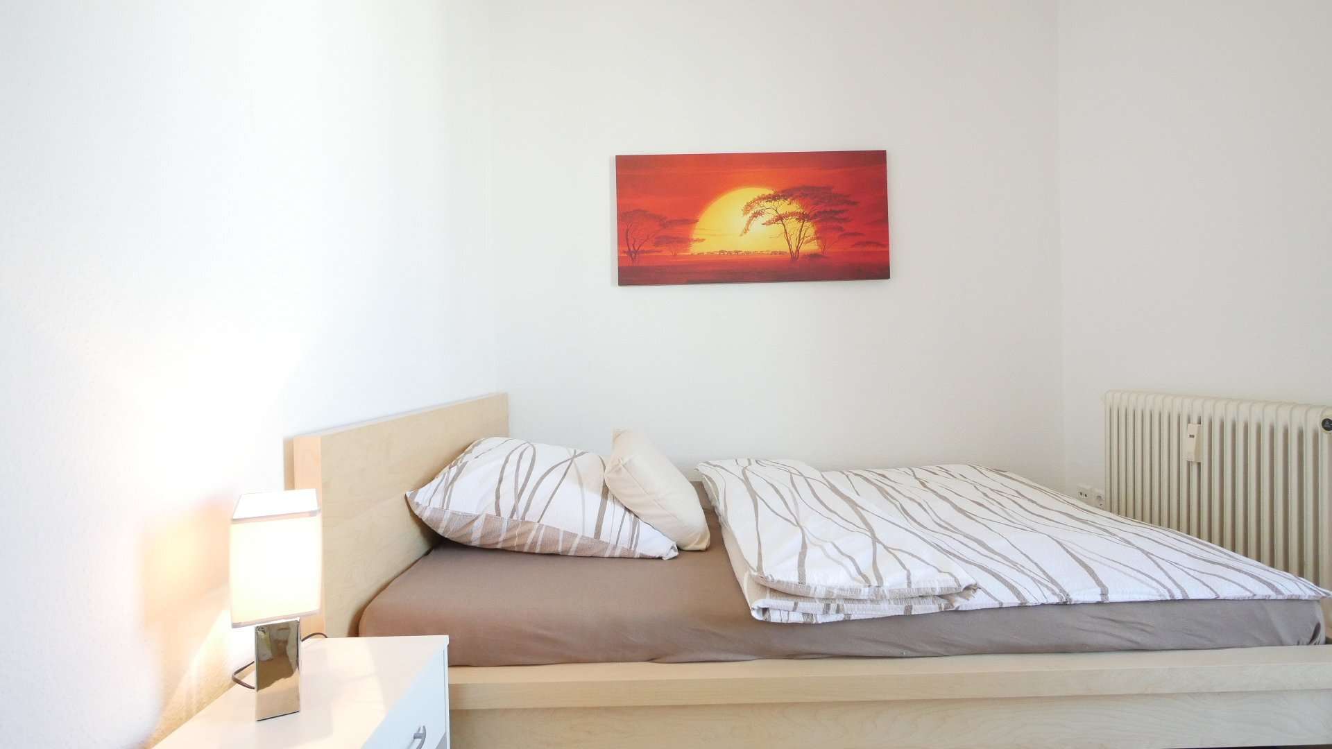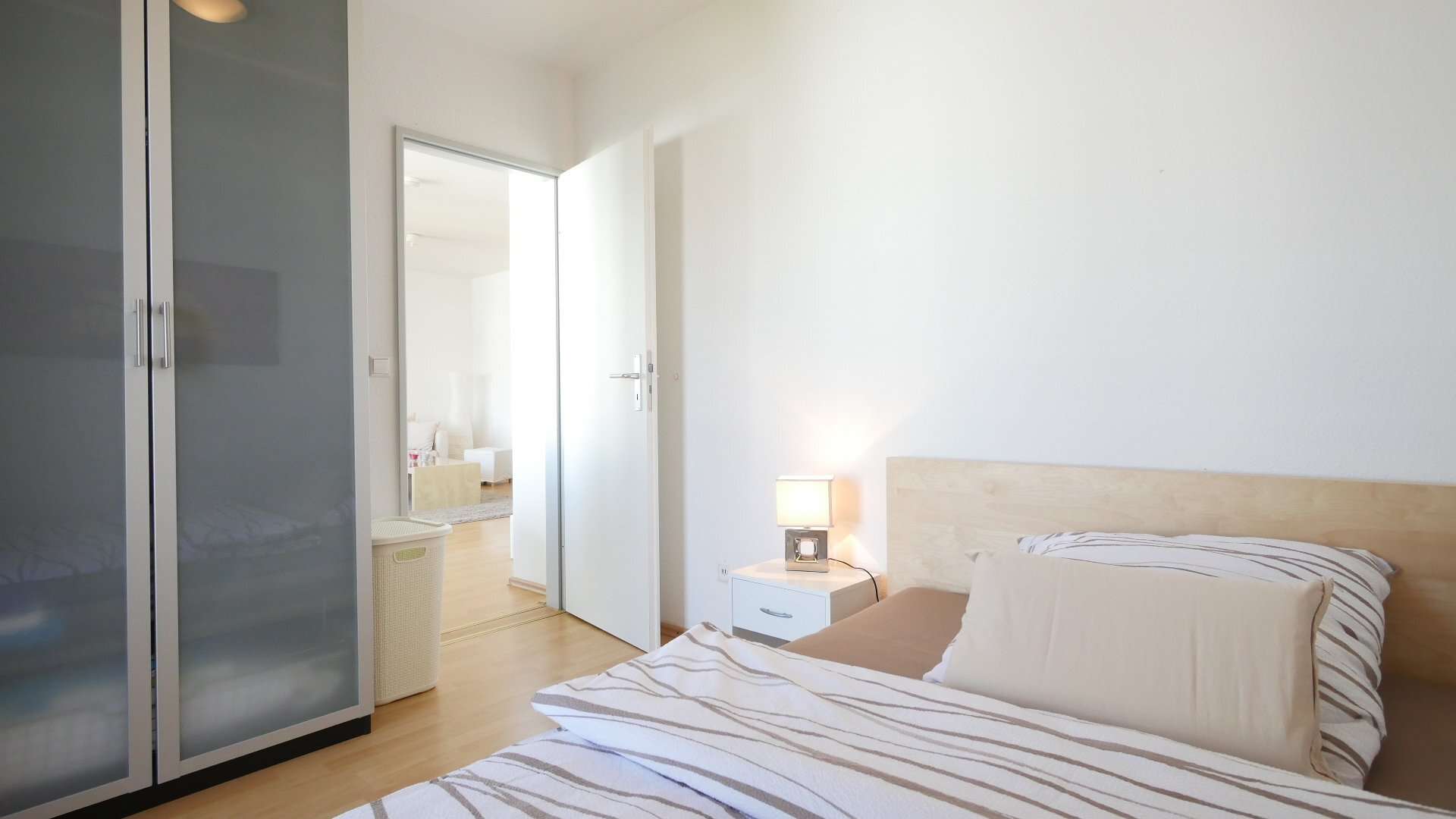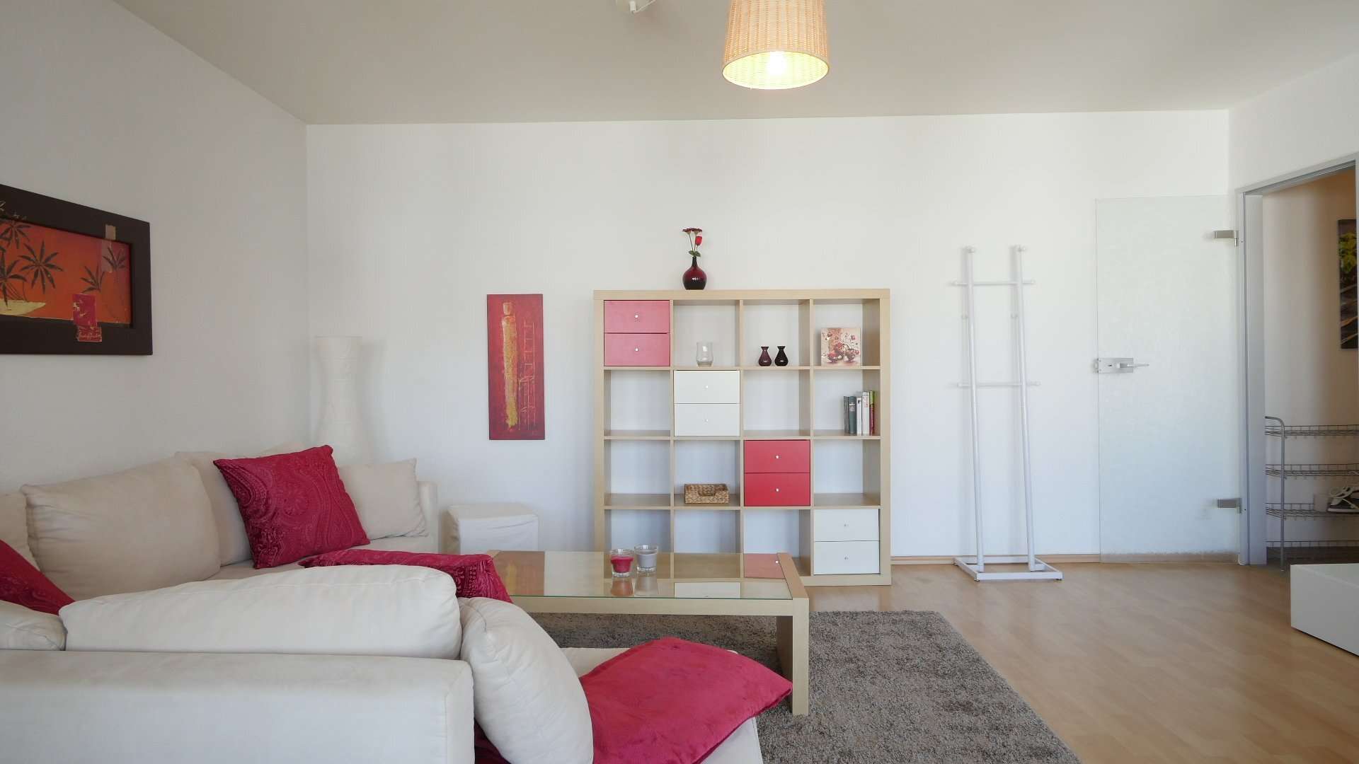 Wohnzimmer mit Sofa, Beistelltisch, Regalen, Esstisch mit 4 Stühlen, kleinem Schreibtisch mit Stuhl, TV. Zugang zum Balkon. Schlafzimmer mit Bett und Kleiderschrank. Pantryküche mit Kühlschrank, 2 Kochplatten, Geschirrspüler, Kaffeemaschine und Küchenutensilien. Badezimmer mit Waschtisch, Dusche, WC. Laminatboden in Wohn- und Schlafzimmer, Fliesen in Küche und Bad. Internet (WLAN) vorhanden.