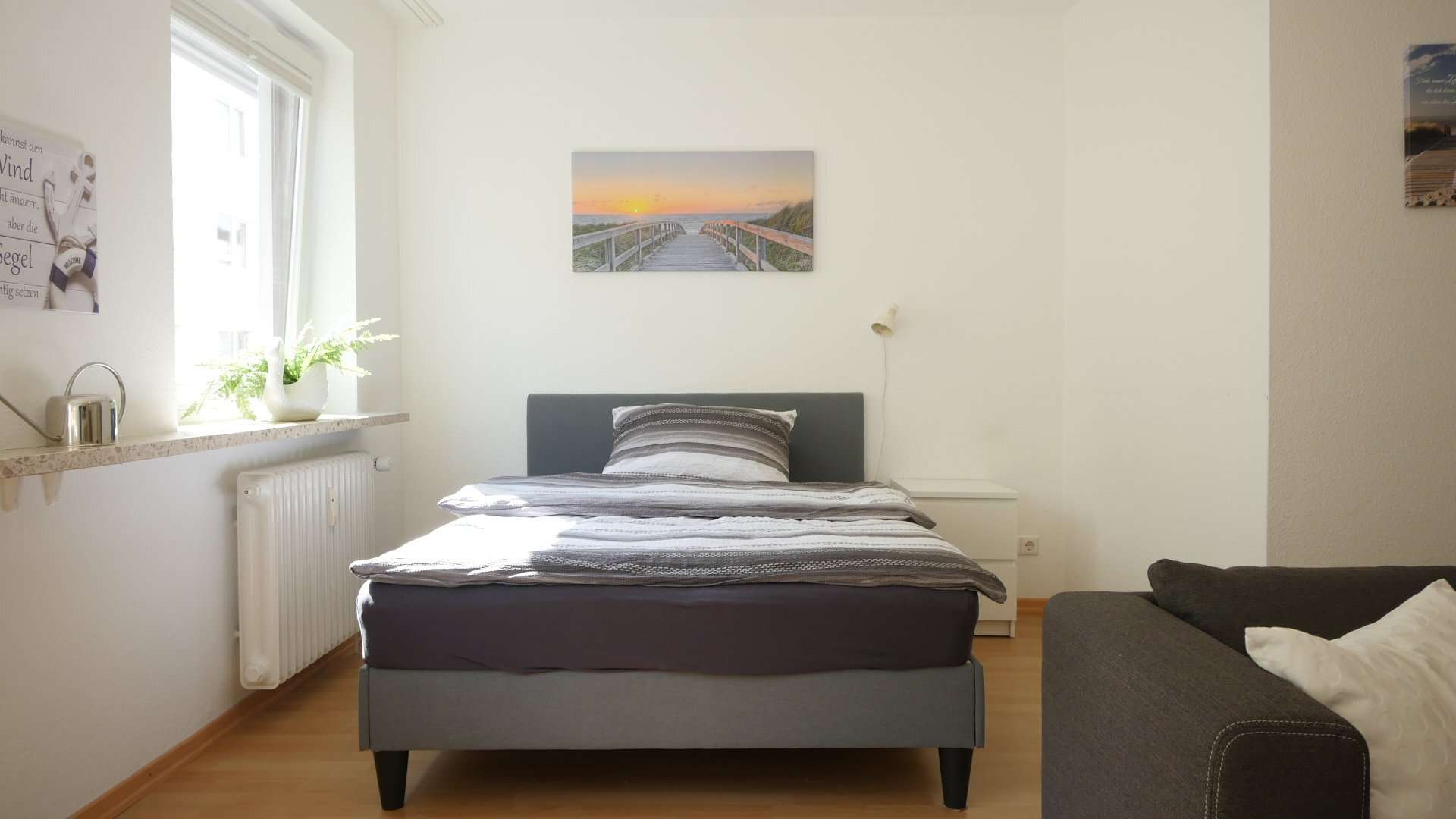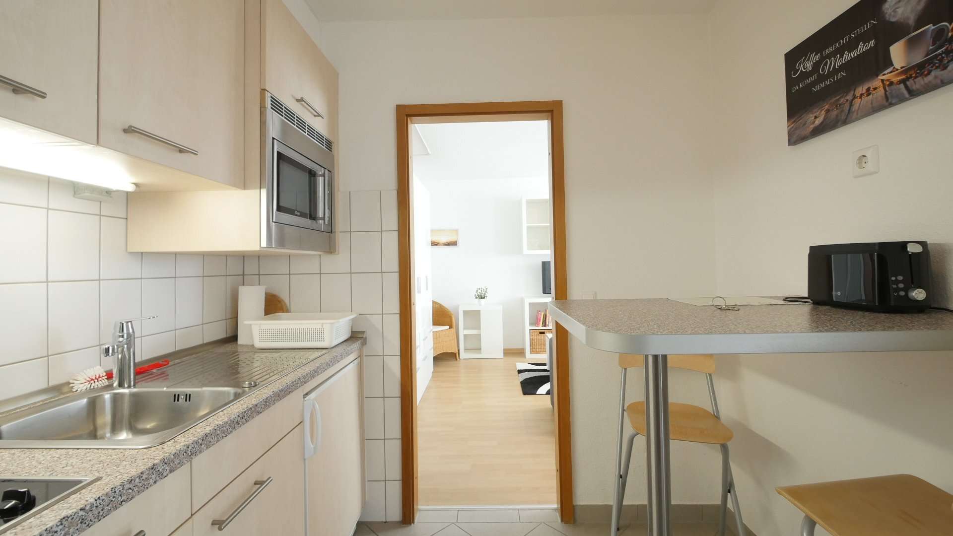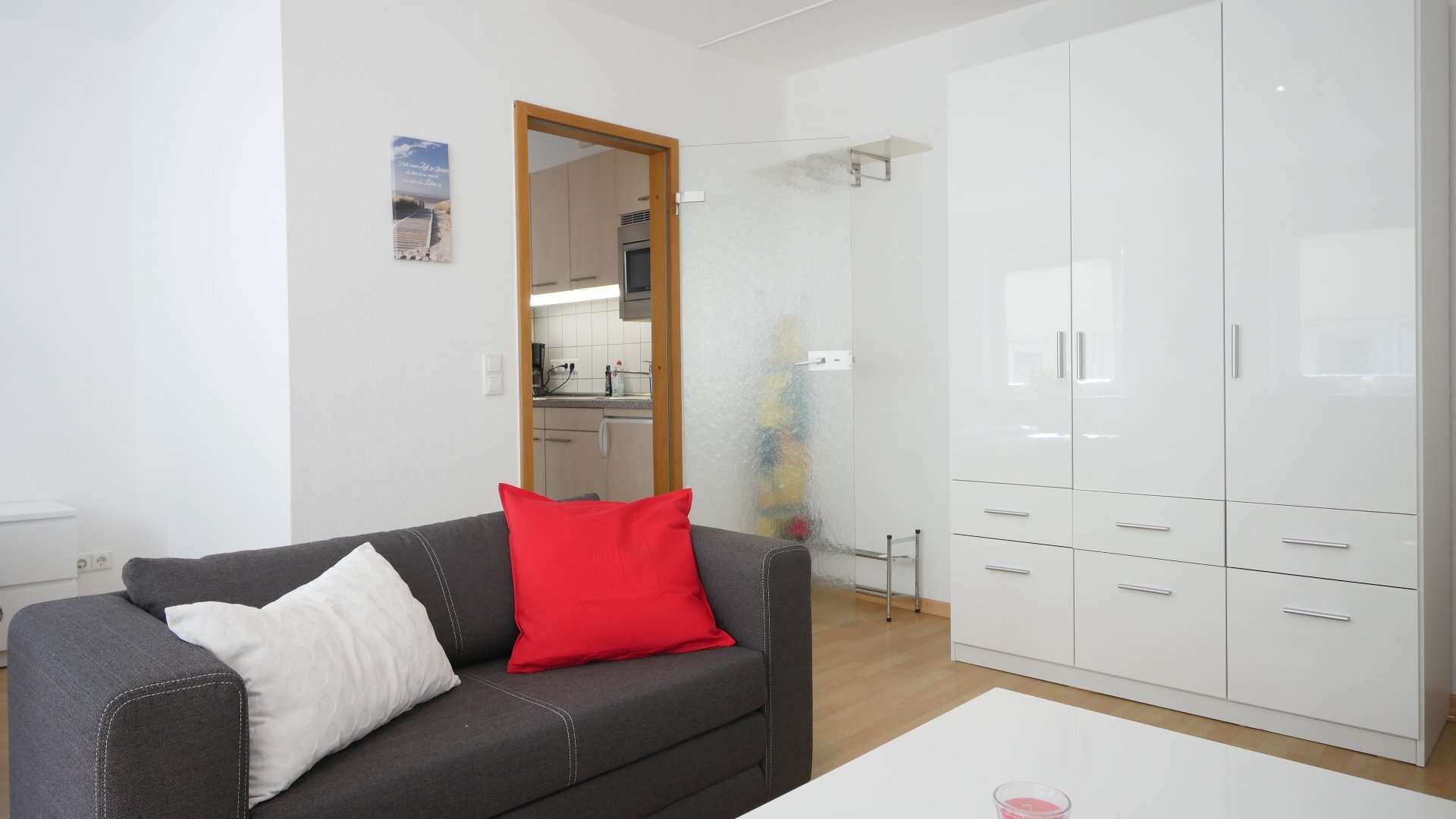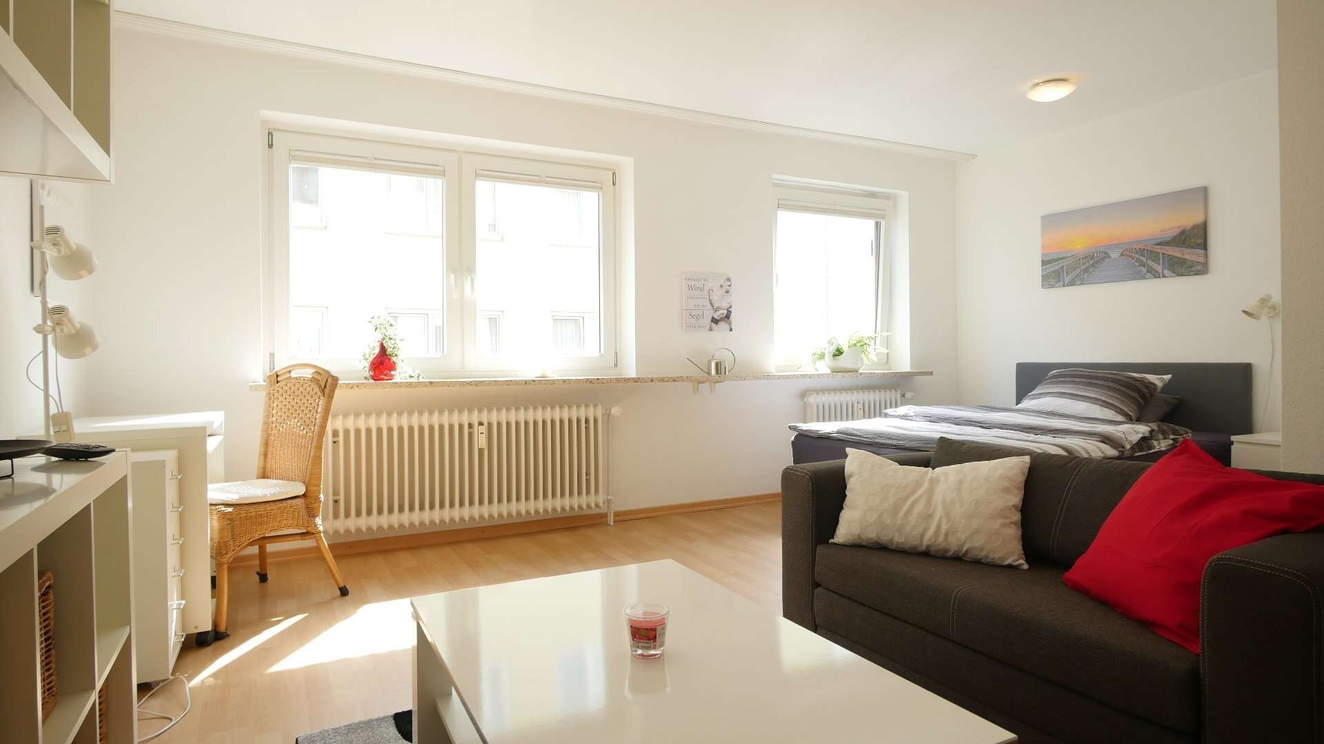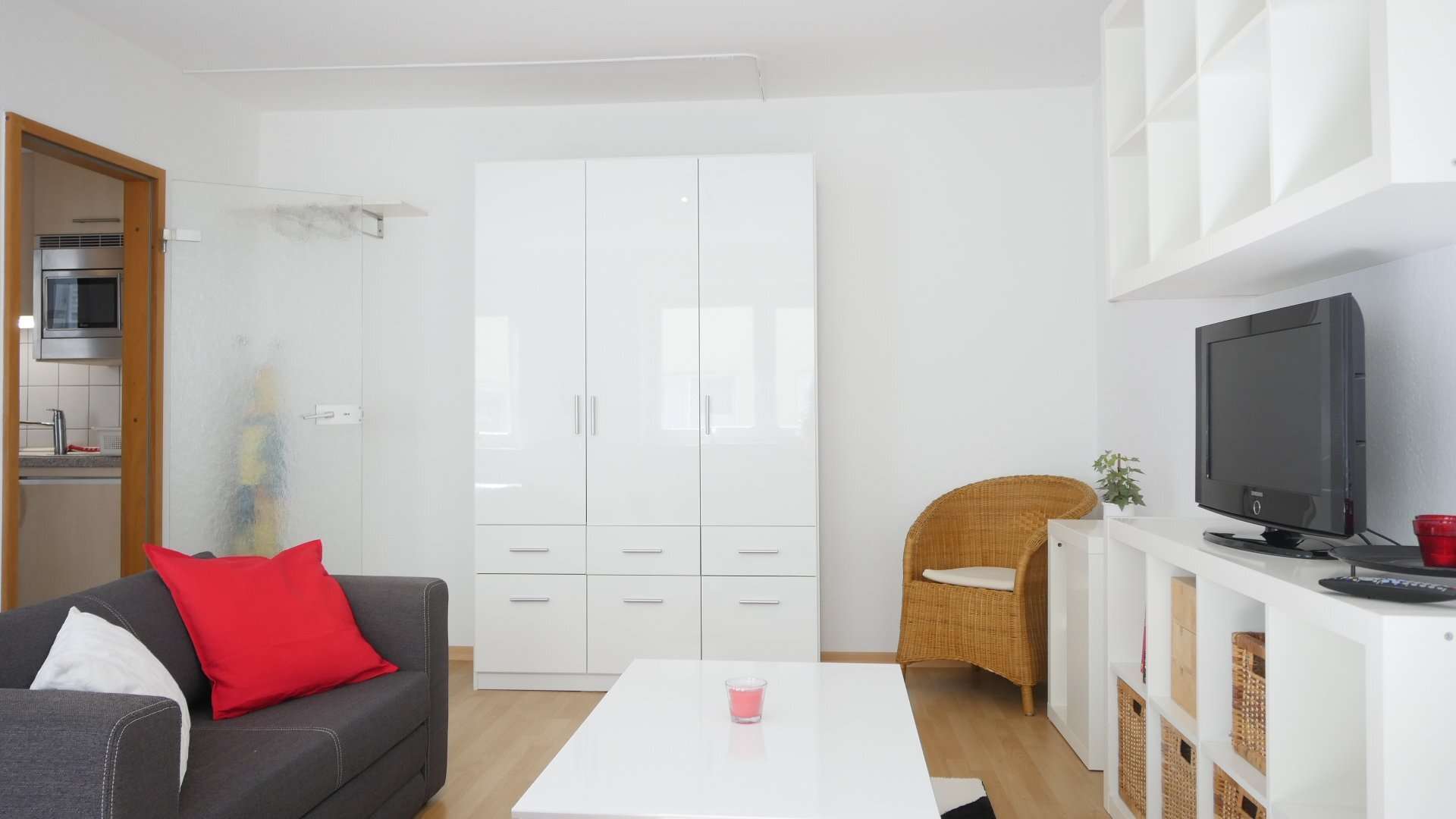 Hell und freundlich möbliert. Wohn-Schlafzimmer mit Fernsehsessel, Sessel, Beistelltisch, Schreibtisch mit Stuhl, Regale, TV, Bett, Kleiderschrank. Küche mit Kühlschrank, Spüle, 2-Platten-Ceranfeld, Mikrowelle, Essplatz und allen Küchenutensilien. Badezimmer mit Badewanne, Waschtisch, WC. Parkett im Wohn-/Schlafbereich, Fliesen in Küche und Badezimmer.