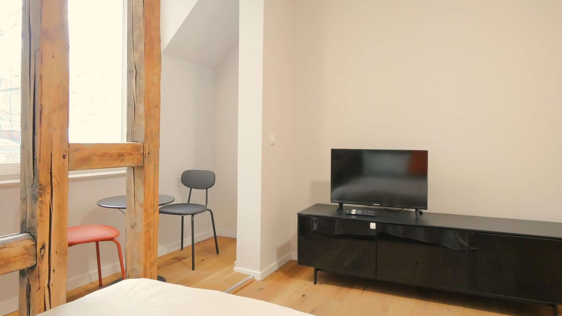 Der Wohn- und Schlafbereich ist geschmackvoll und hochwertig eingerichtet mit einem komfortablen Bett (140cmx200cm) samt Nachttisch, einem Essplatz mit Tisch und zwei Stühlen, einem Schreibtisch mit Stuhl, einem Sideboard sowie einem Kleiderschrank.