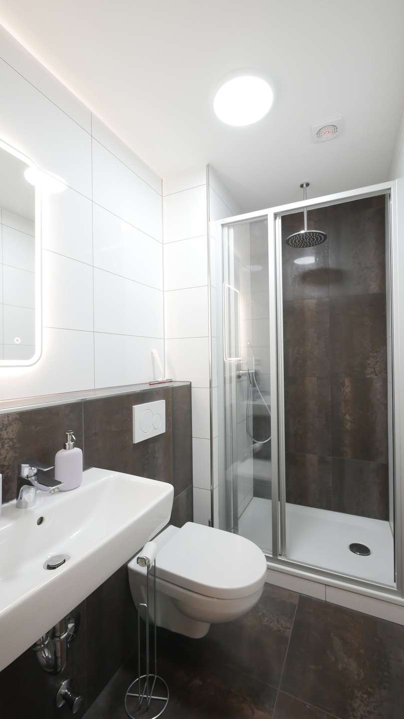 Das moderne Badezimmer ist mit hochwertigen Armaturen und einer Dusche mit Rainshower-Duschkopf ausgestattet, die für besonderen Komfort sorgt.