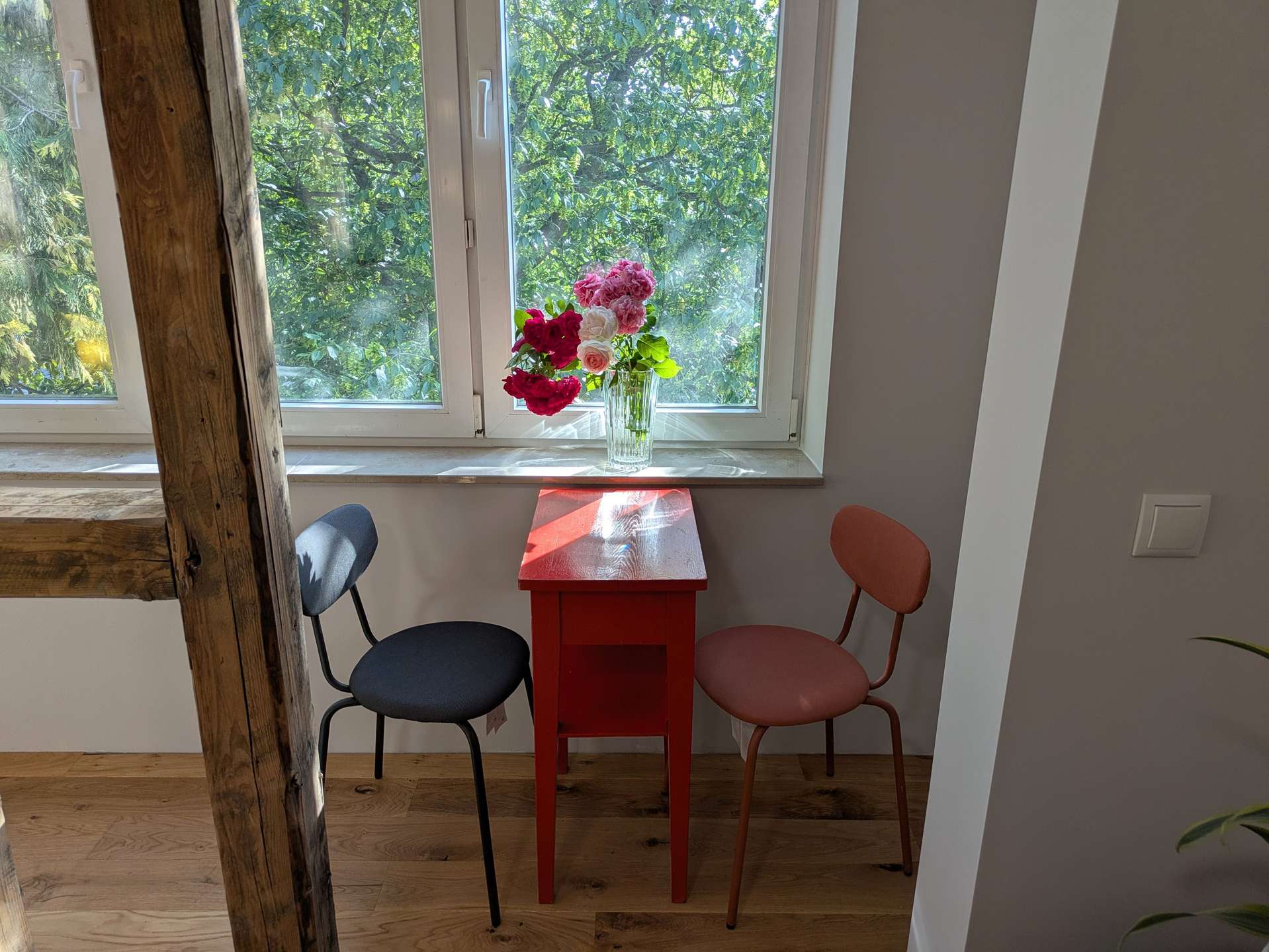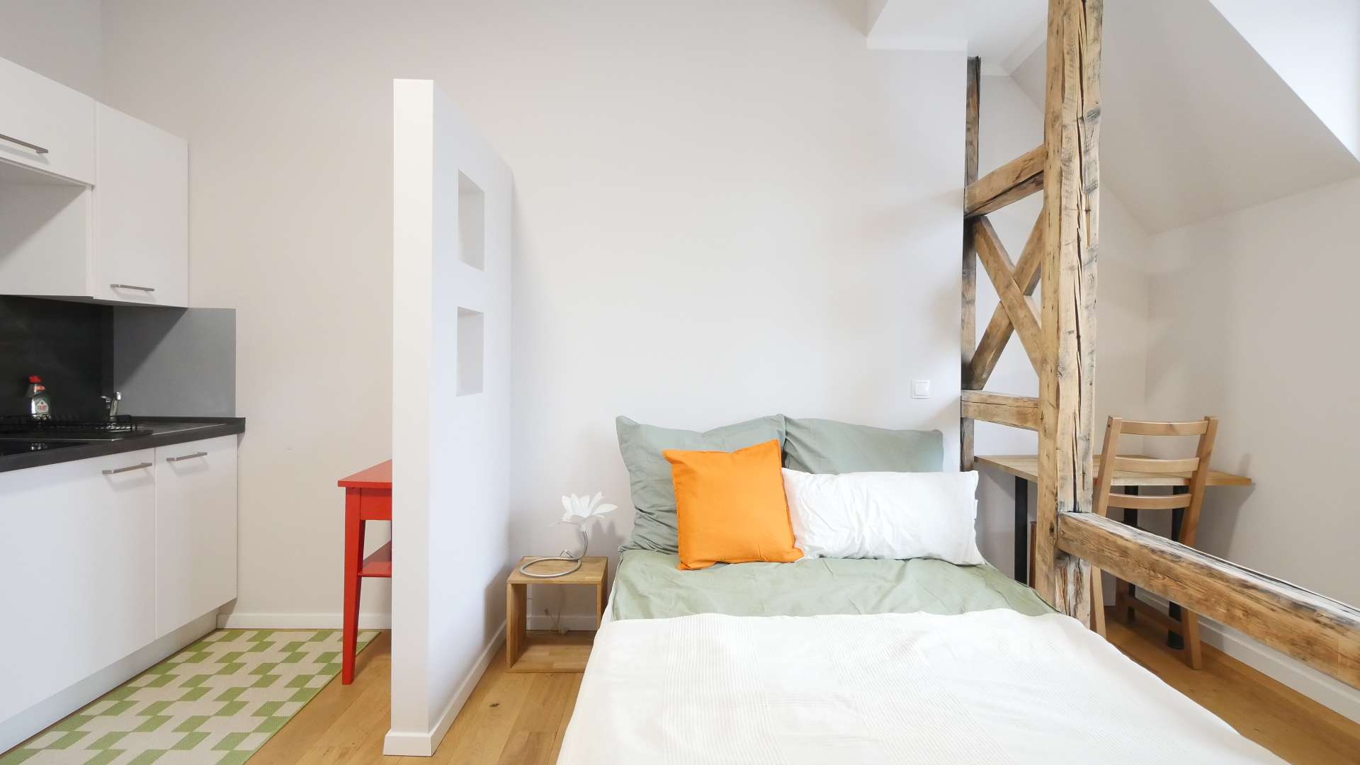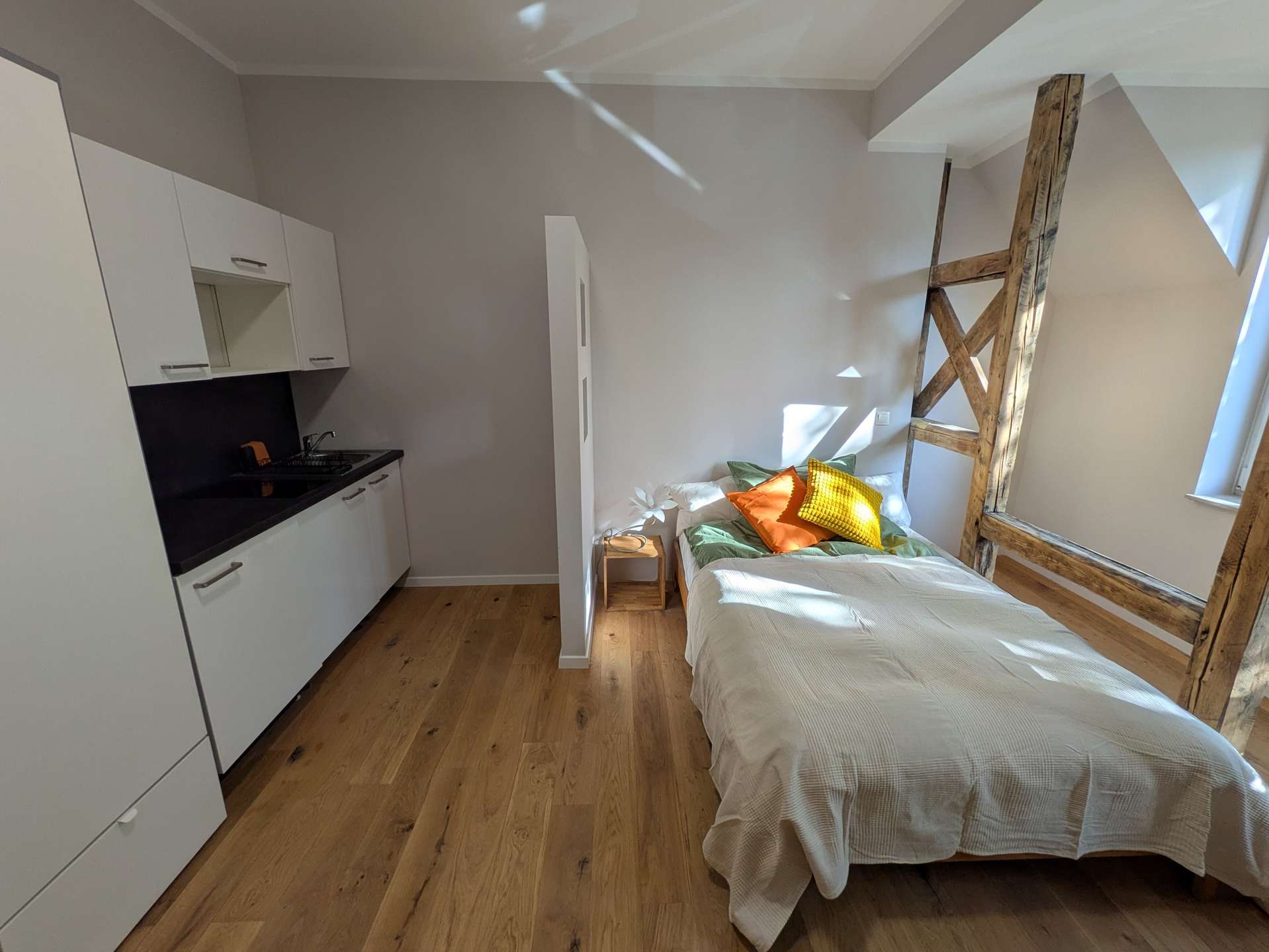 Dank der sichtbaren Fachwerkbalken ist das Bett optisch vom Essbereich und der Home-Office-Ecke abgegrenzt, wodurch ein klar strukturierter Grundriss entsteht. Trotz offenem Wohnkonzept entsteht so ein angenehmes und gegliedertes Raumgefühl.