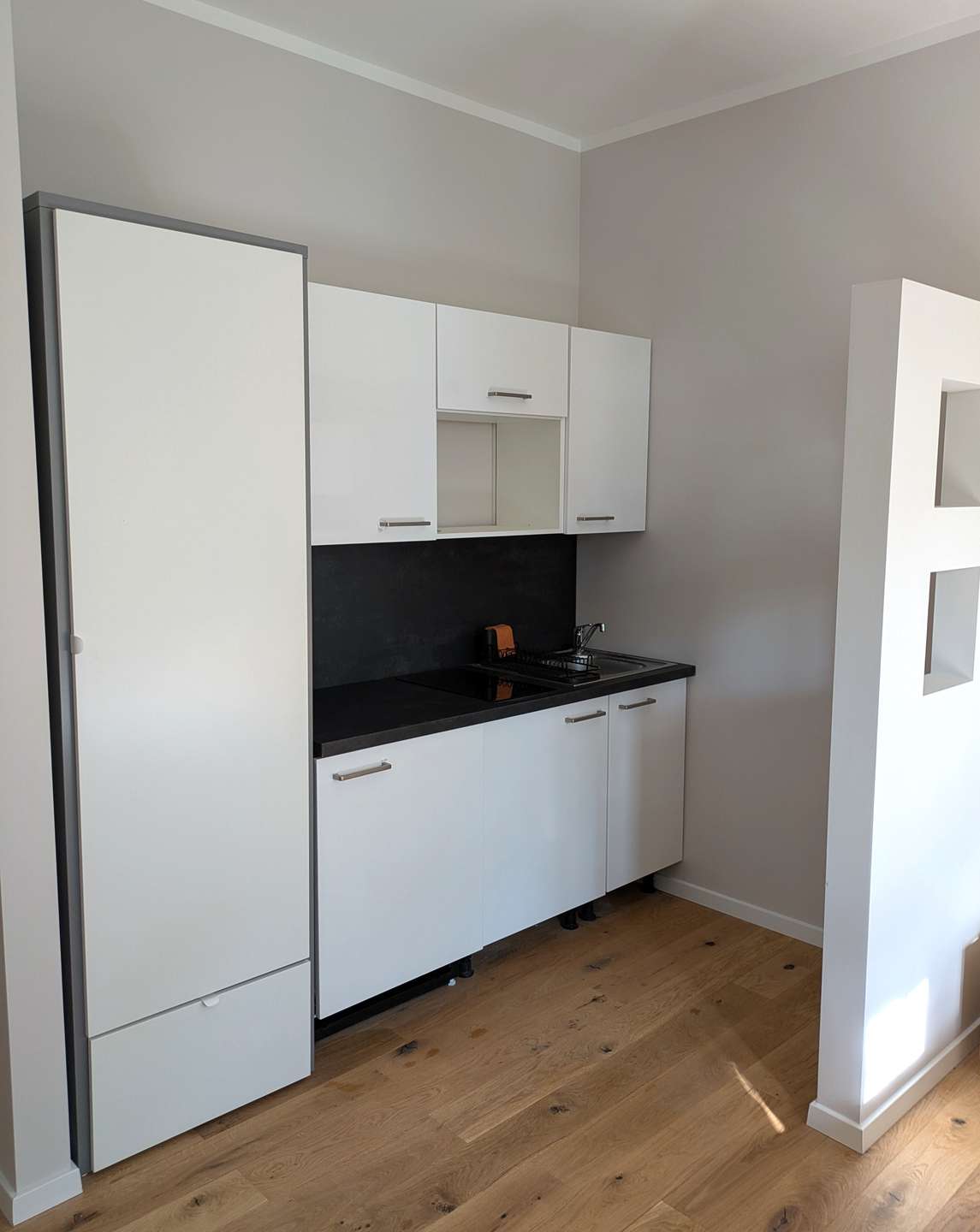 Die offen integrierte Küchenzeile ist durch eine kleine Wand dezent vom übrigen Wohnraum abgetrennt. Sie bietet alles, was Sie für den Alltag benötigen: Spüle, 2-Platten-Cerankochfeld, Kühl-Gefrier-Kombination, reichlich Stauraum sowie eine vollständige Ausstattung mit allen notwendigen Küchenutensilien – von Töpfen und Pfannen bis hin zu Besteck, Geschirr und Gläsern.