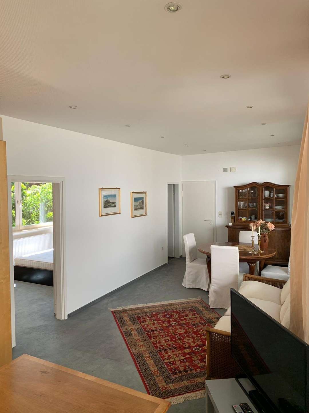 Großes Wohnzimmer mit Sofa, Schränken, Beistelltischen, Flachbild-TV, antikem Esstisch mit Stühlen. Schlafzimmer mit Doppelbett (160 x 200cm) und Kleiderschrank. Kleine Küche mit Kombimikrowelle, 2 Kochplatten, Spüle und Küchenutensilien. Bad mit Dusche, Waschtisch, WC. Fliesen in Küche und Bad, ansonsten heller Teppichboden.