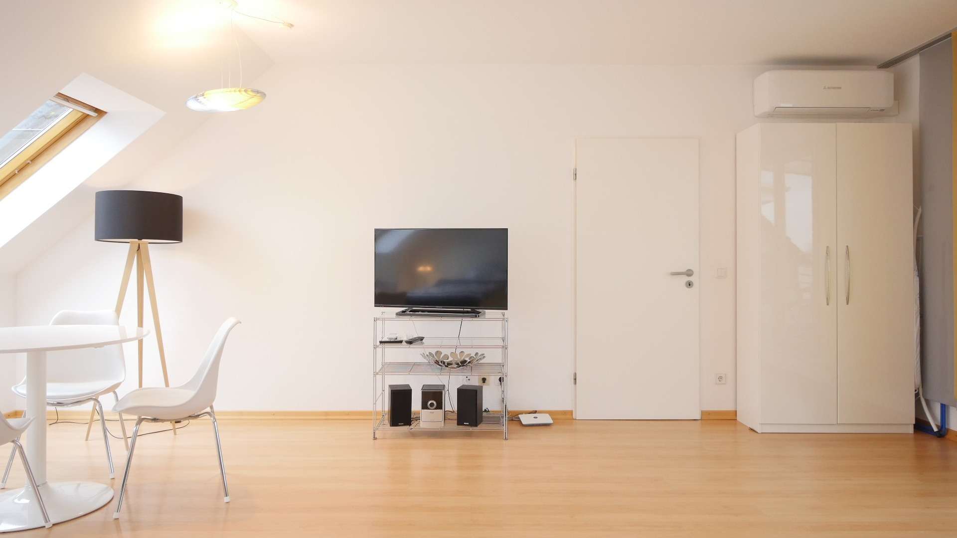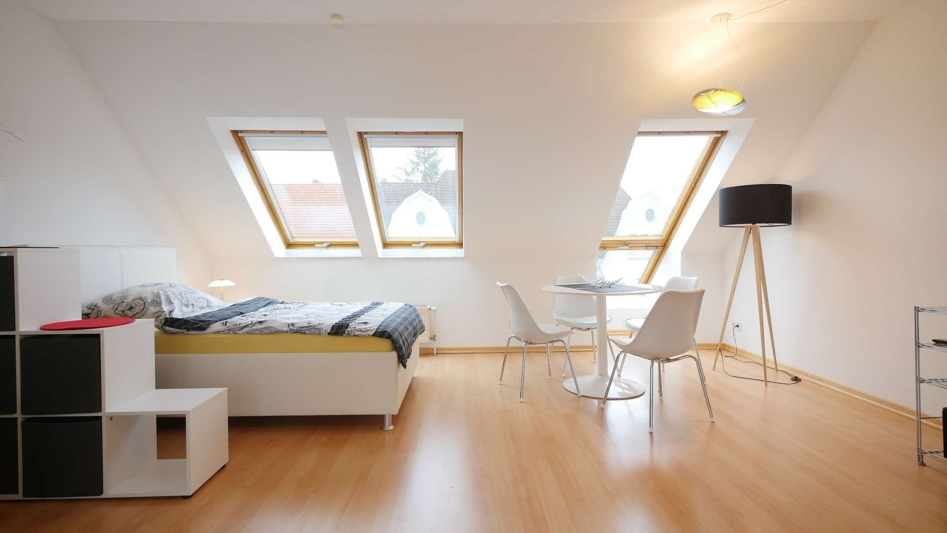 Großer Wohn-Schlafraum mit Bett (140 x 200cm), Ecksofa, Flachbild-TV, Regal, Esstisch mit Stühlen, Kleiderschrank und Teppich. Zugang zur Dachterrasse. Komplett ausgestattete Küche mit Kühl-Gefrierkombination, Ceranfeld, Backofen, Mikrowelle, Geschirrspüler und allen erforderlichen Küchenutensilien. Flur mit großem Einbauschrank und Gegensprechanlage. Bad mit Waschtisch, Dusche, WC und Waschmaschine. Fliesen in Bad und Küche, heller Laminatboden im Wohn-/ Schlafbereich und im Flur. Internet vorhanden.