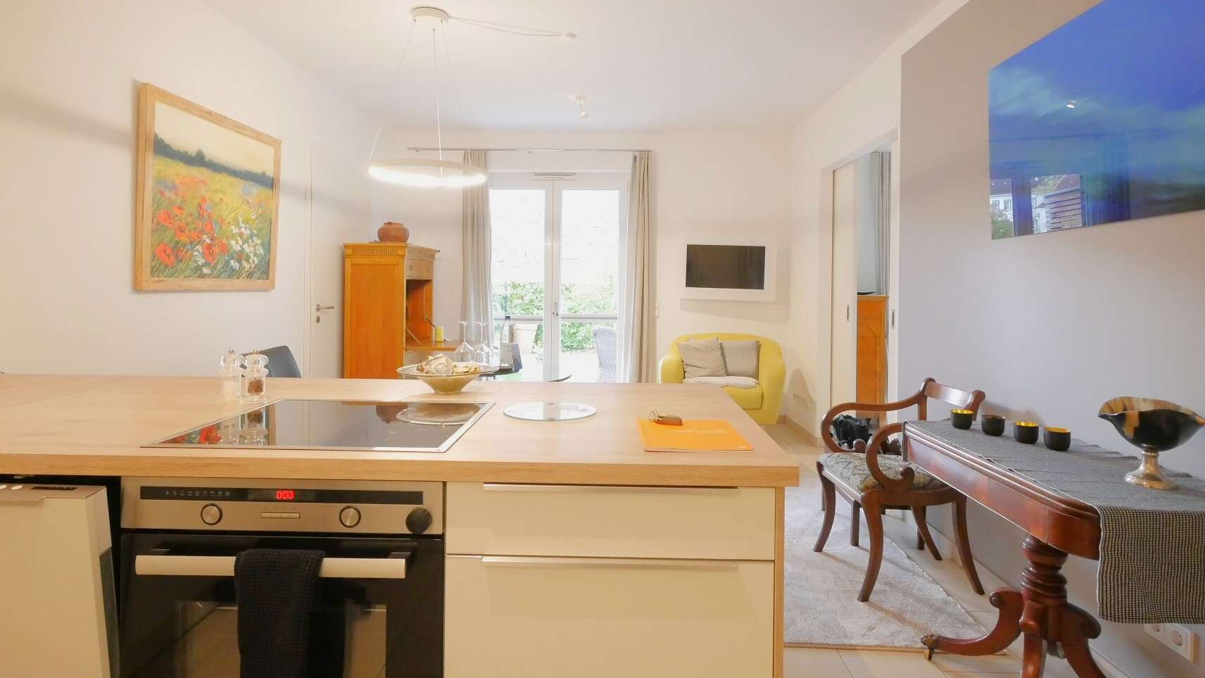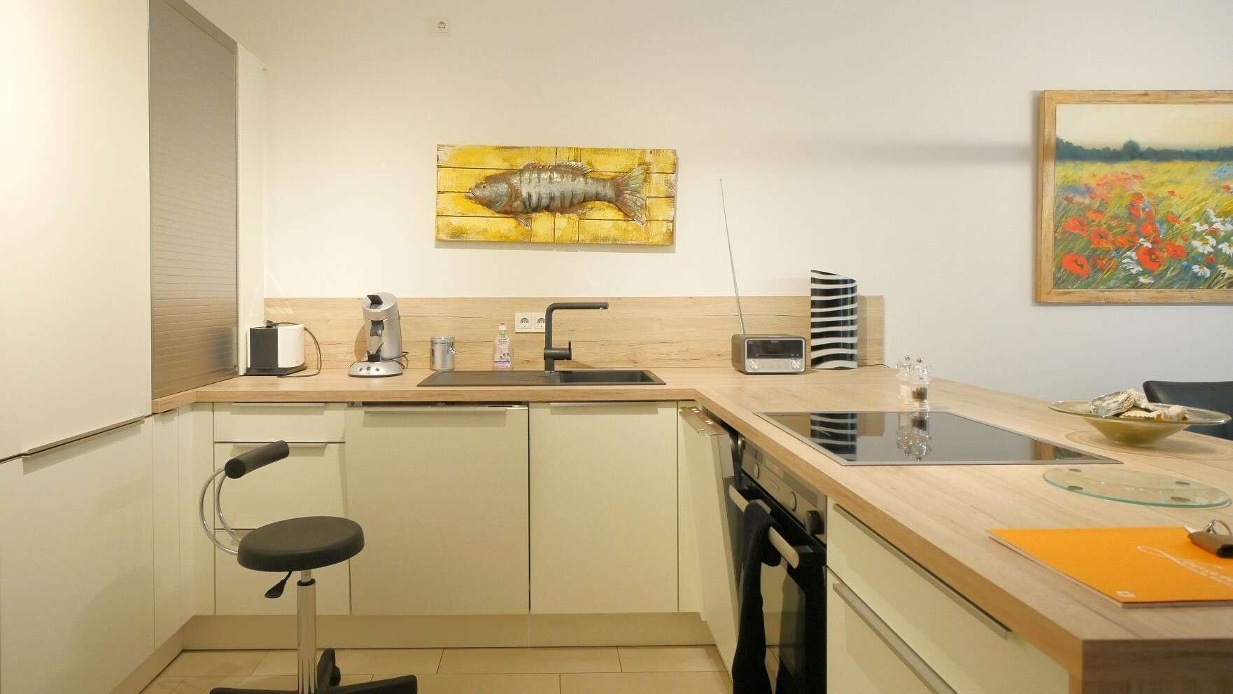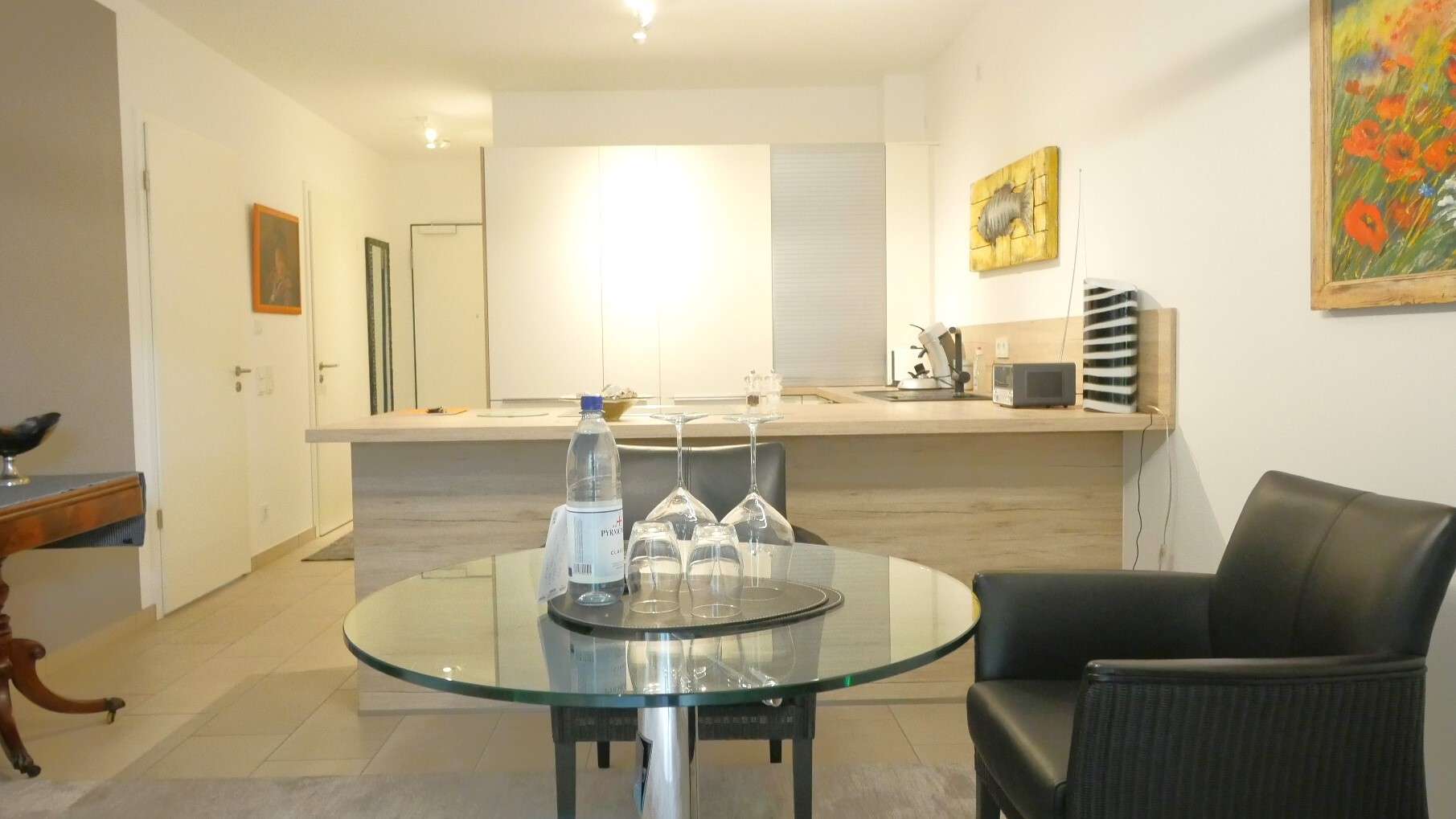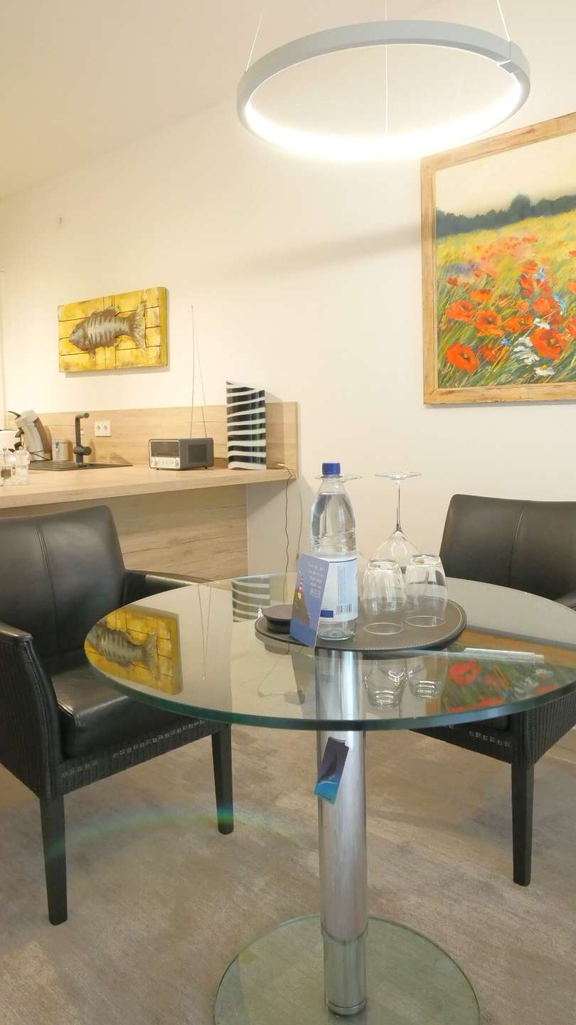 Der Weg führt weiter in den offen gestalteten Wohn- und Essbereich mit einer modernen Einbauküche. Diese ist vollständig sehr gut ausgestattet – mit einem großen Kühlschrank samt zwei Gefrierschubladen, einer Spülmaschine, Filterkaffeemaschine und Senseo Kaffeemaschine sowie sämtlichen Küchenutensilien – und lässt somit keine Wünsche offen. Ein Glastisch und zwei Loungesessel sorgen hier für eine angenehme Wohnatmosphäre.