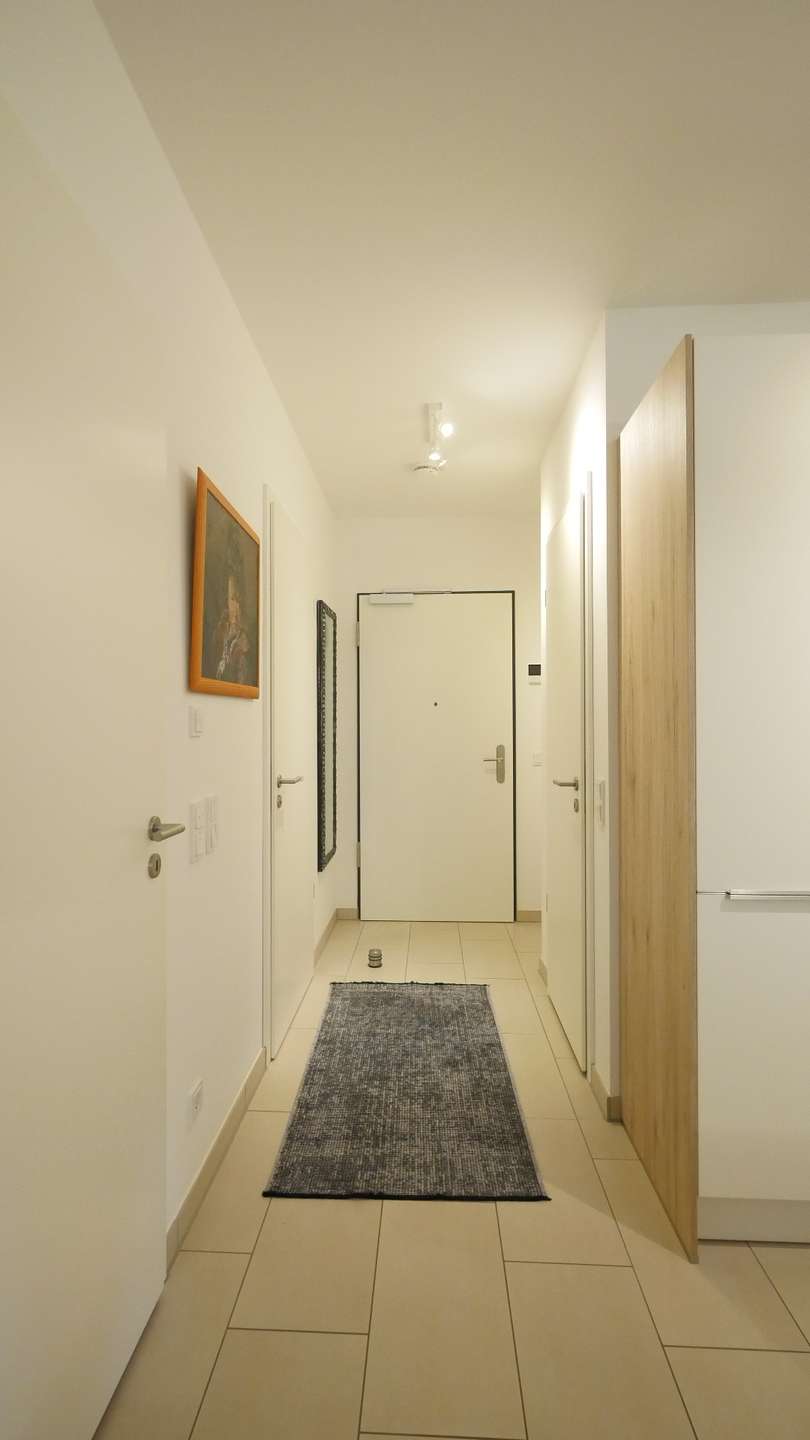 Beim Betreten der Wohnung gelangt man in den Eingangsbereich. Rechter Hand befindet sich das moderne Badezimmer, sandfarben gefliest, mit einer großzügigen Walk-in-Dusche, linker Hand ein praktischer Hauswirtschaftsraum, ausgestattet mit Waschmaschine und Trockner und zahlreichen Regalen und Schränken, die zusätzliche Staumöglichkeiten bieten.
