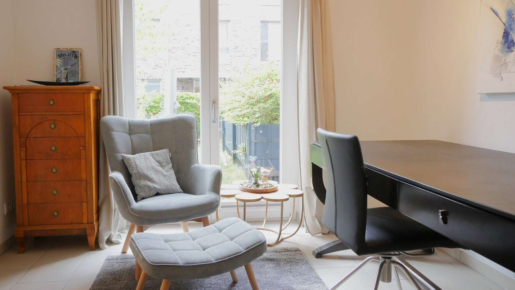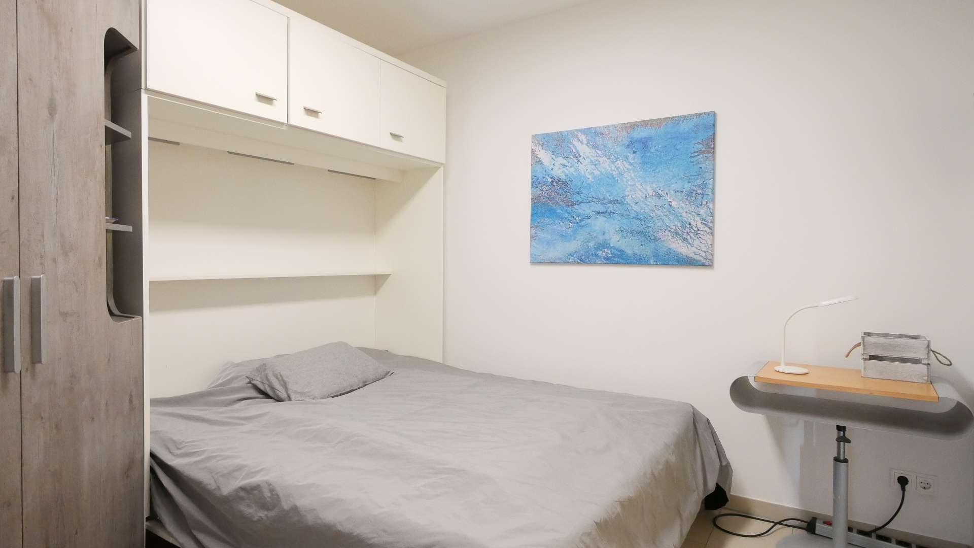 Vom Wohnzimmer aus gelangt man in das Schlafzimmer, das mit einem 1,60 m breiten Bett sowie einem geräumigen Kleiderschrank möbliert ist. Auch das separate Ess-/Arbeitszimmer ist von hier aus zugänglich und bietet mit einem Tisch und vier Stühlen zusätzlichen Raum für gemeinsame Mahlzeiten mit Gästen oder zum Arbeiten.