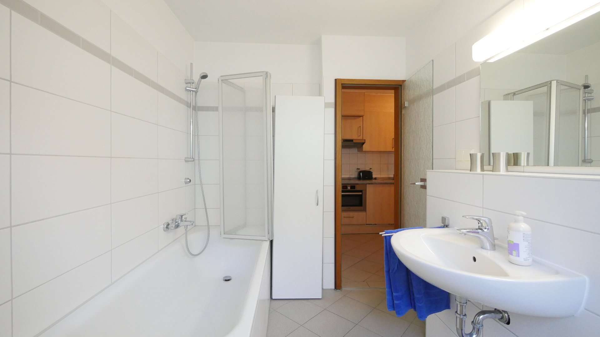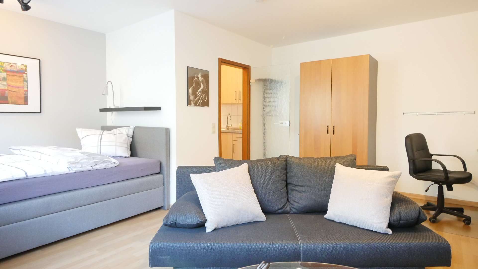 Hell und freundlich möbliert. Wohn-Schlafzimmer mit hellem Sofa, Sessel, Beistelltisch, Regale, TV, Esstisch mit Stühlen, großes Boxspringbett, Kleiderschrank. Küche mit Kühlschrank, Spüle, 2-Platten-Ceranfeld, Kombi-Backofen, Essplatz und allen Küchenutensilien. Neues Badezimmer mit Badewanne, Waschtisch, WC. Parkett im Wohn-/Schlafbereich, Fliesen in Küche und Badezimmer.