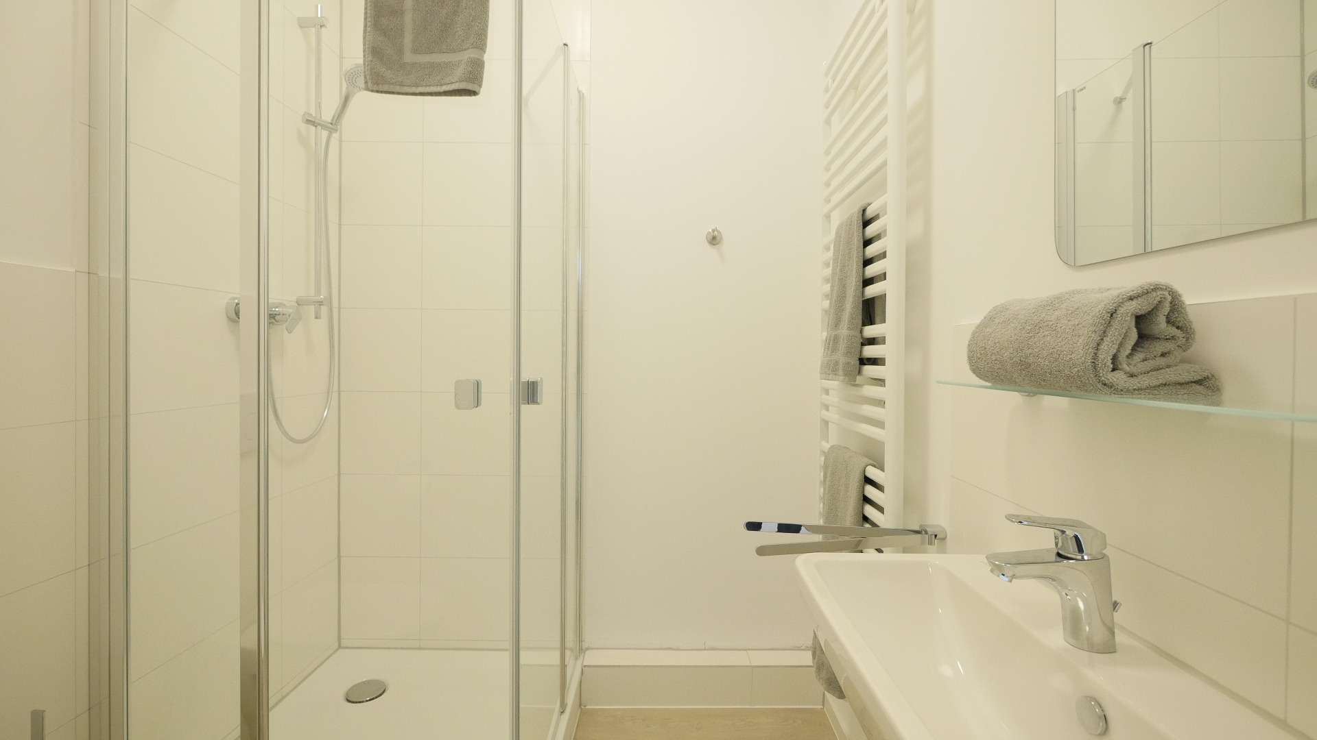 Das Badezimmer ist mit einer Dusche, Waschbecken und WC ausgestattet.