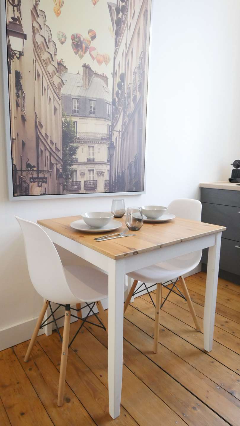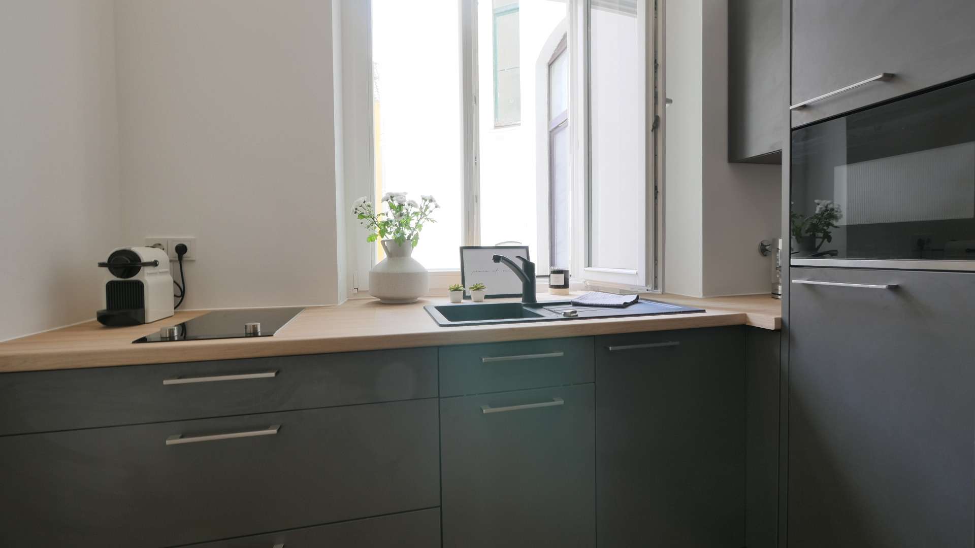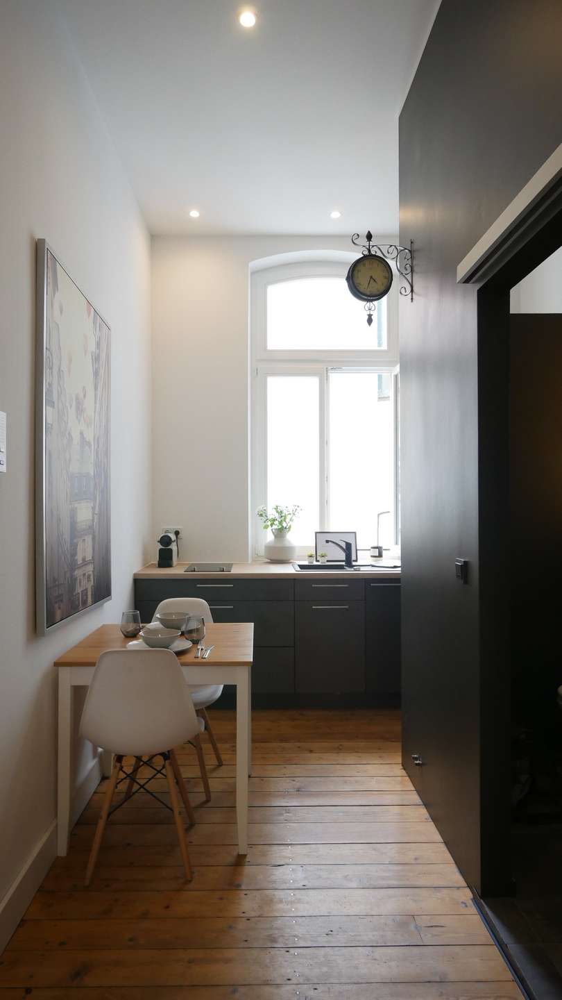 Die hübsche Einbauküche verfügt über einen 2-Platten-E-Herd, Ofen, Kapselkaffeemaschine und Kühlschrank sowie allen erforderlichen Küchenutensilien. Hier befindet sich auch die Waschmaschine der Marke AEG und ein gemütlicher Esstisch mit zwei Stühlen.