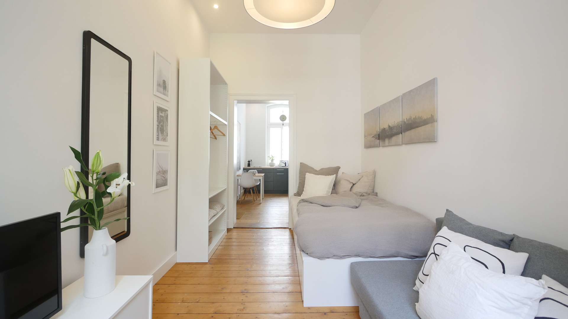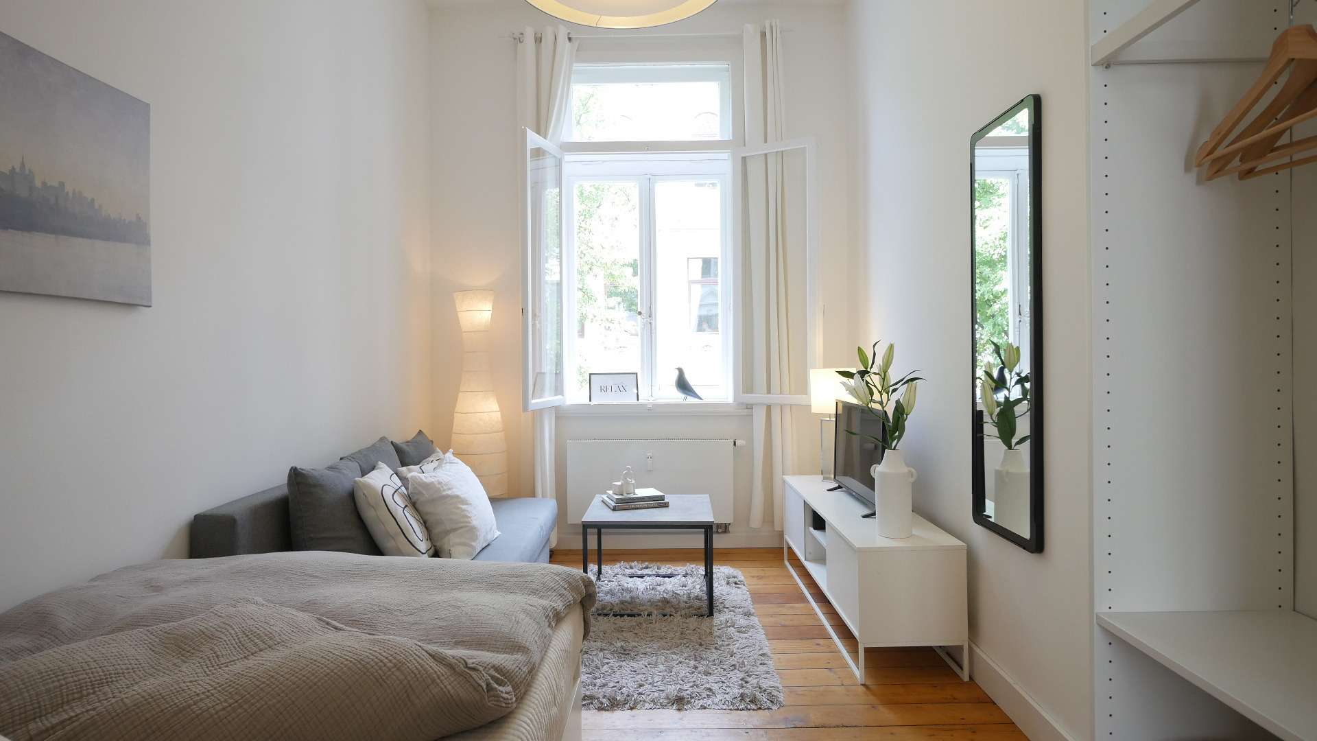 Das Wohn-/Schlafzimmer ist mit einem grauen Stoffsofa, Beistelltisch, Lowboard mit Flachbild TV, 120cm breiten Bett und einem Kleiderschrank eingerichtet.