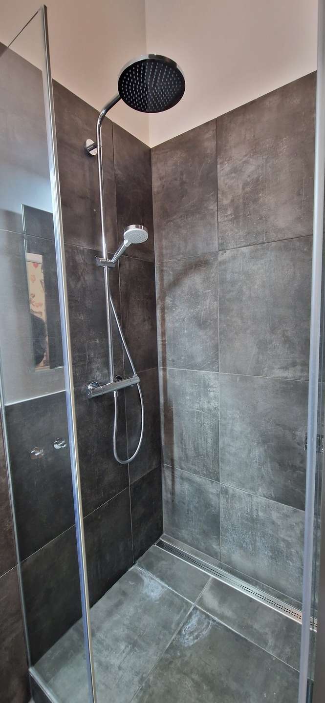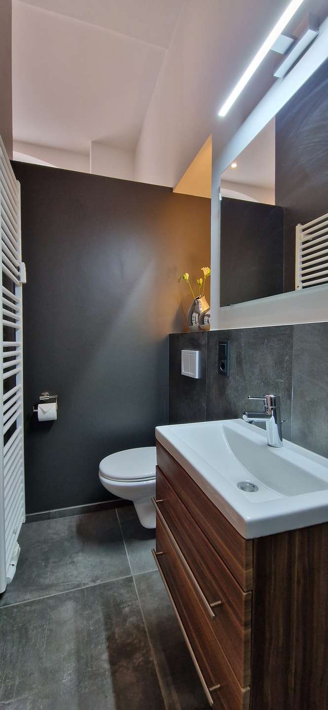 Das dunkel geflieste Badezimmer ist mit einer Handtuchtrockner-Heizung, Waschbecken, WC sowie Dusche mit Regenduschfunktion und Glaswänden ausgestattet.