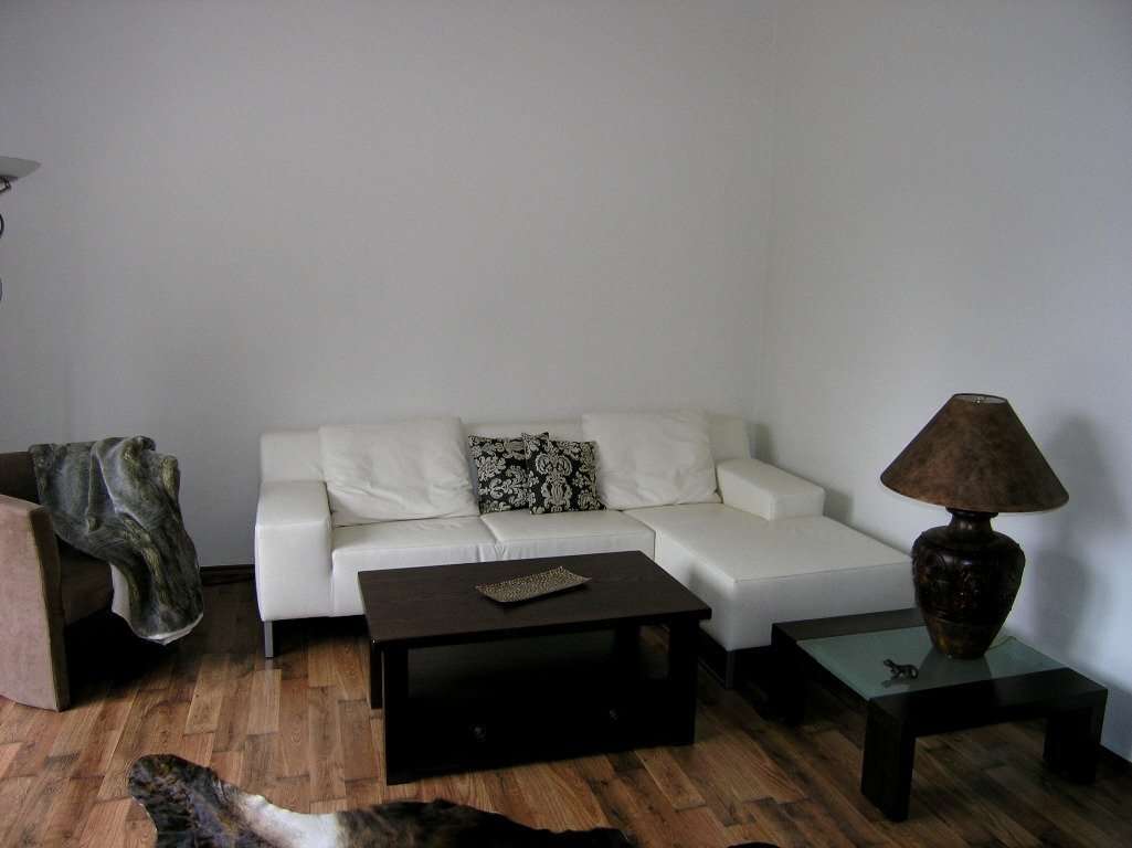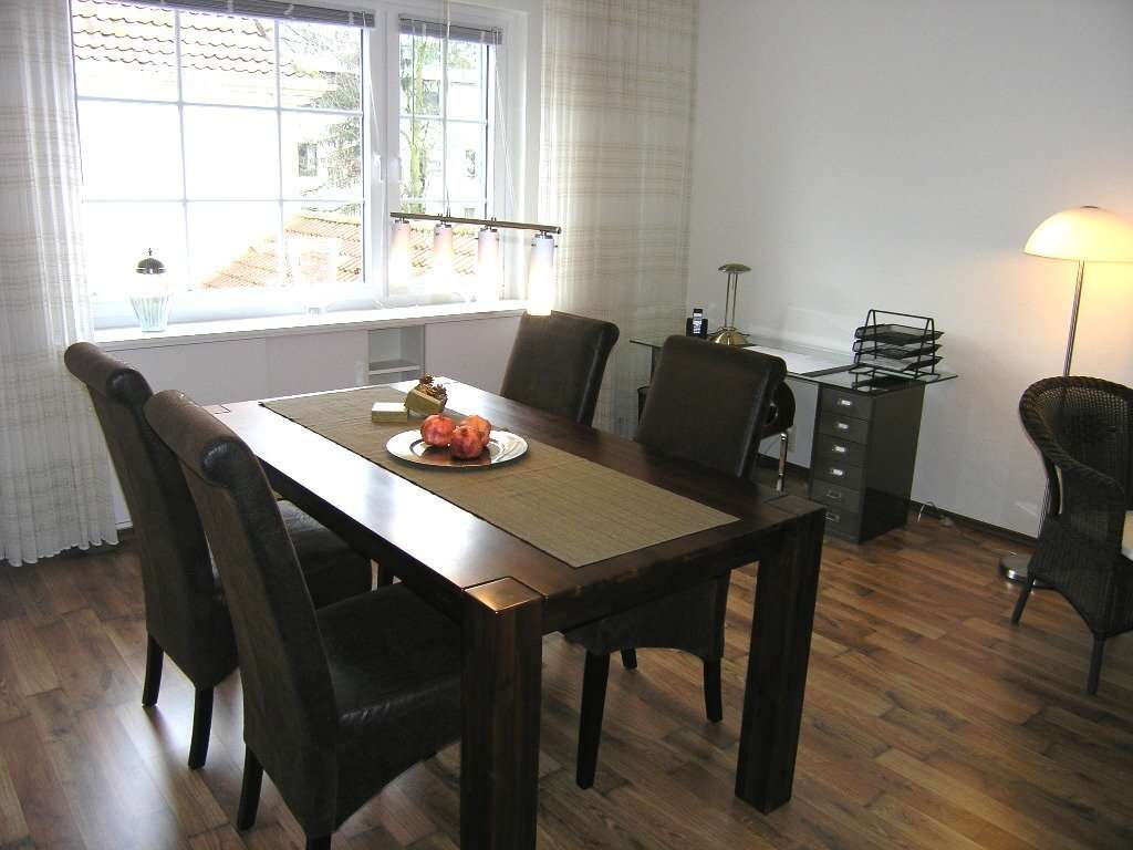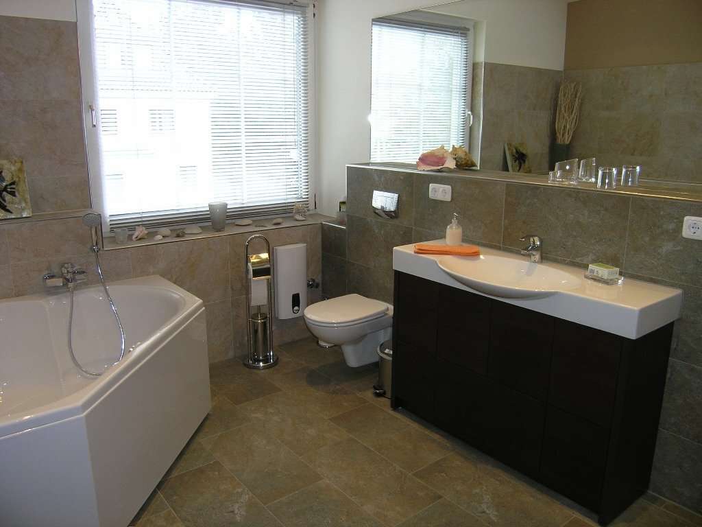 Großes Wohnzimmer mit weißem Ledersofa, Sessel, Couchtisch, TV mit DVBT-Receiver. Zugang zum mit Gartenmöbeln und Markise ausgestatteten Balkon. Offener Durchgang zum Nebenzimmer mit Esstisch mit 4 Stühlen und kleinem Schreibtisch und Stuhl. Laminatfußboden. Schlafzimmer mit großem Doppelbett, Nachttischen und großem Schwebetürenschrank. Beiger Teppichboden. Komplett ausgestattete Küche mit 4-Platten-Ceranfeld, Backofen, Dunstabzugshaube, Mikrowelle, Geschirrspüler, Kühl-Gefrierkombination, Spüle und allen erforderlichen Küchenutensilien. Laminatboden. Ein Badezimmer mit Badewanne, Handtuchtrockner, Waschtisch, WC. Natursteinfliesen an Wänden und Boden. Das zweite Badezimmer verfügt über einen bodenebenen Duschbereich mit Glasabtrennung und Regendusche sowie über einen Glas-Waschtisch und ein WC.