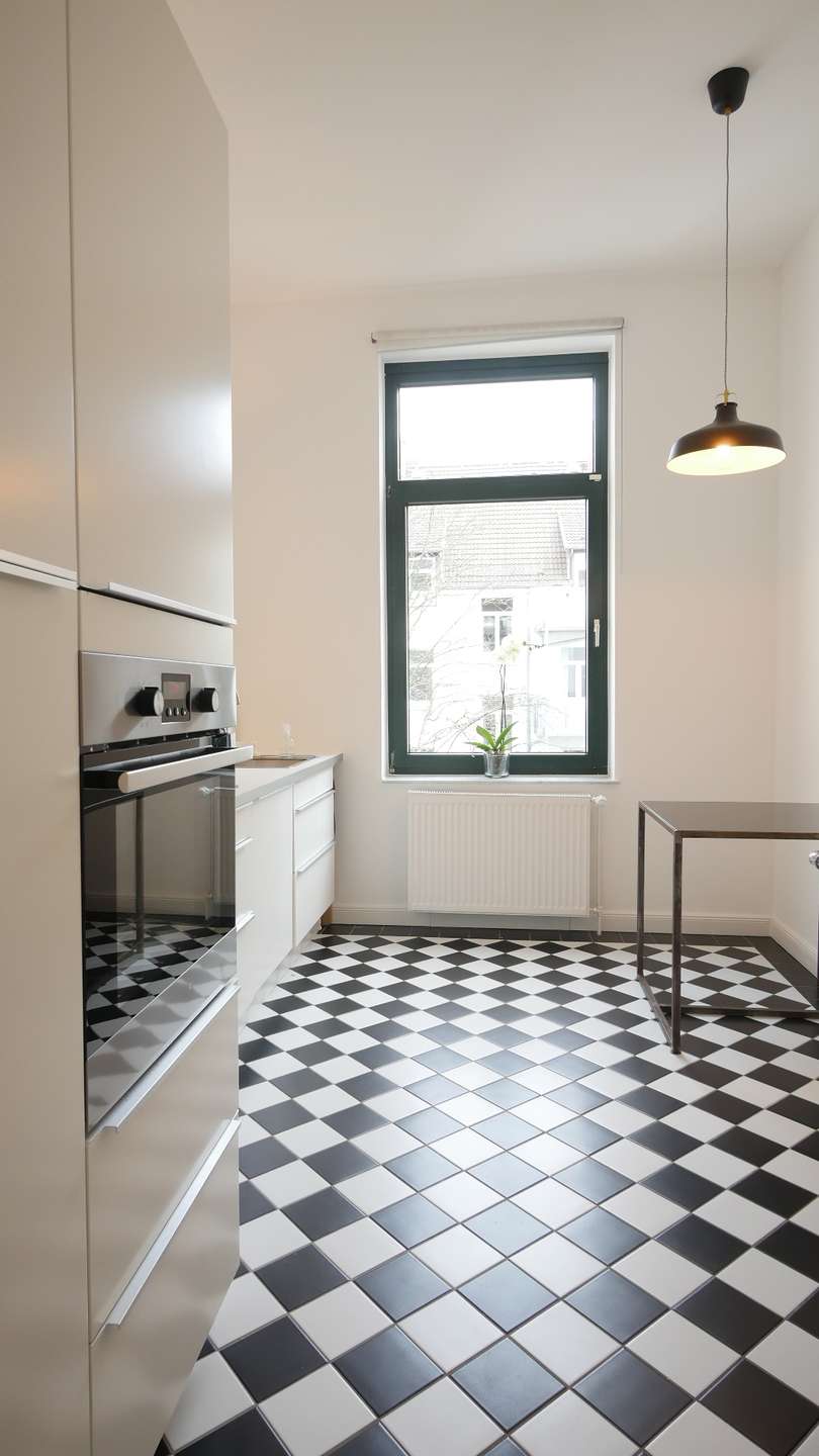 Die Küche mit schwarz-weißen Fliesenboden in Karomuster lässt keine Wünsche offen: Sie ist mit einer großen Kühl-/Gefrierkombination, Ofen, Induktionsherd, Dunstabzugshaube, Spülmaschine, und allen erforderlichen Küchenutensilien ausgestattet. Hier befindet sich auch die Waschmaschine sowie ein schöner Frühstückstisch.