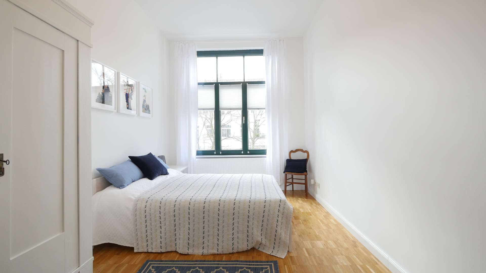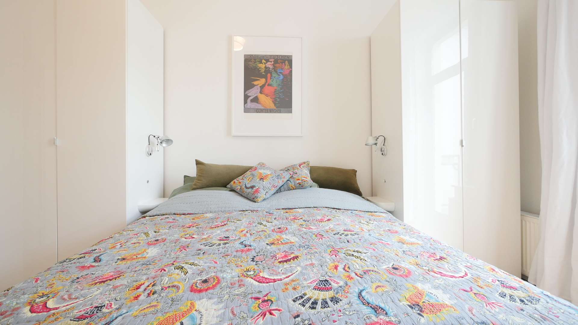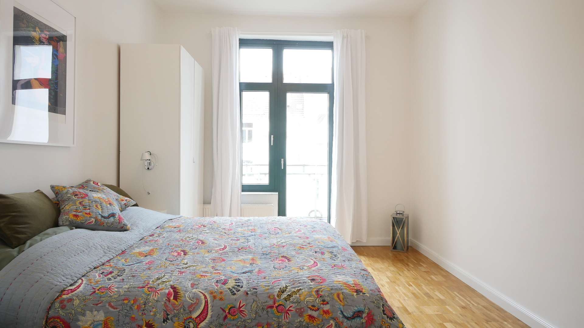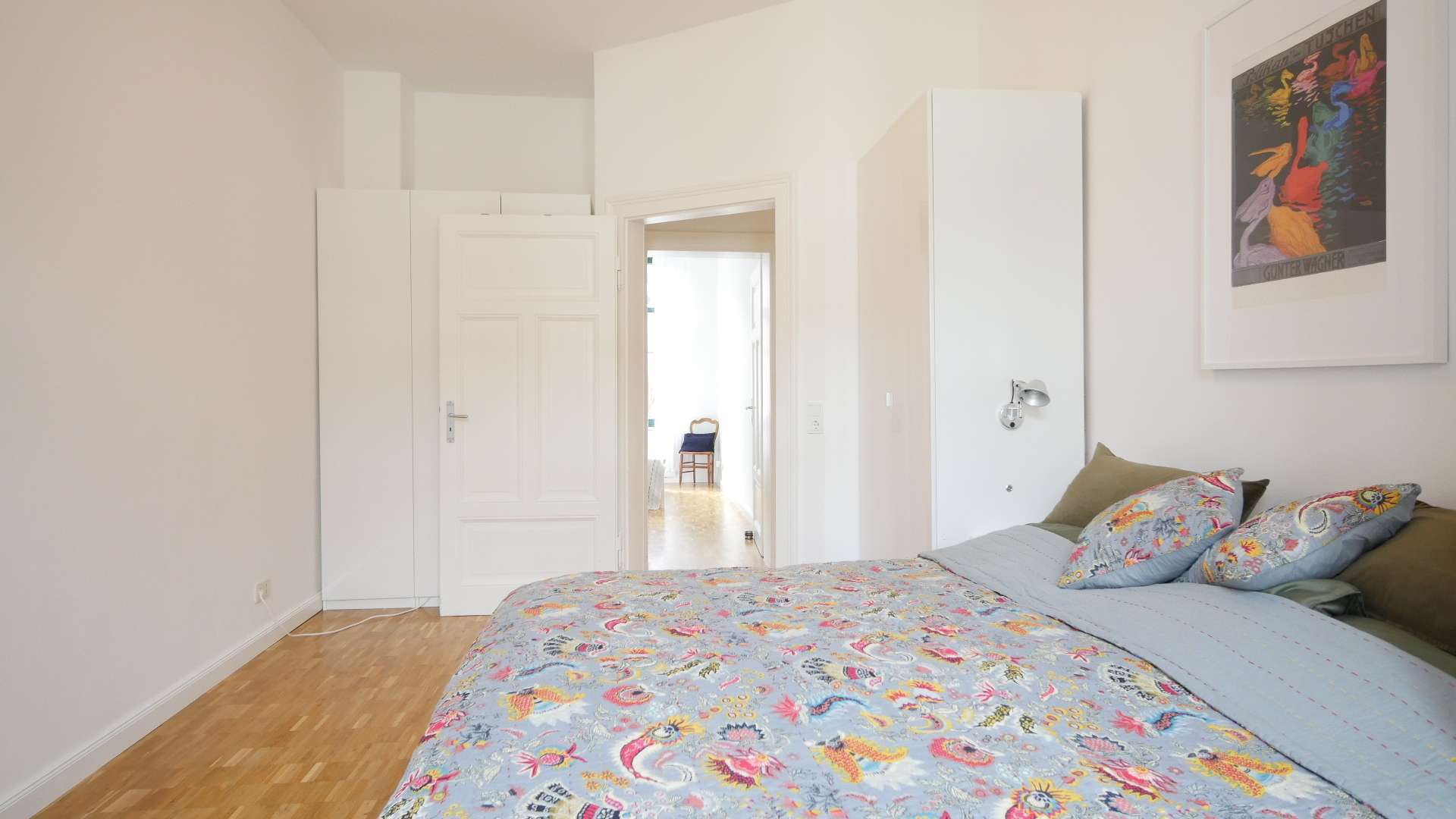 Das Schlafzimmer mit Zugang zum Balkon verfügt über ein Doppelbett und zwei große Kleiderschränke, sowie über einen im Schrank verbauten Trockner.