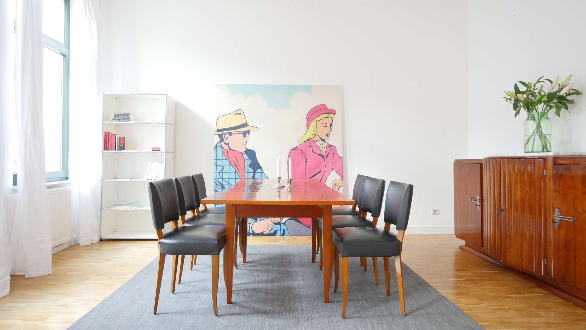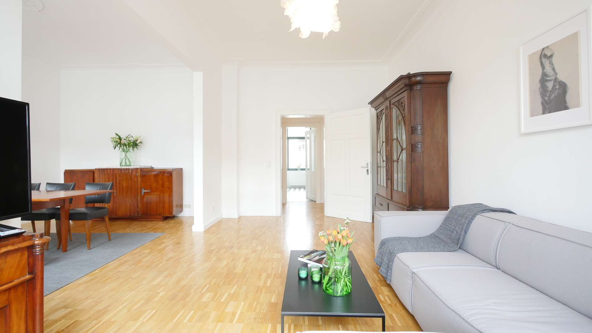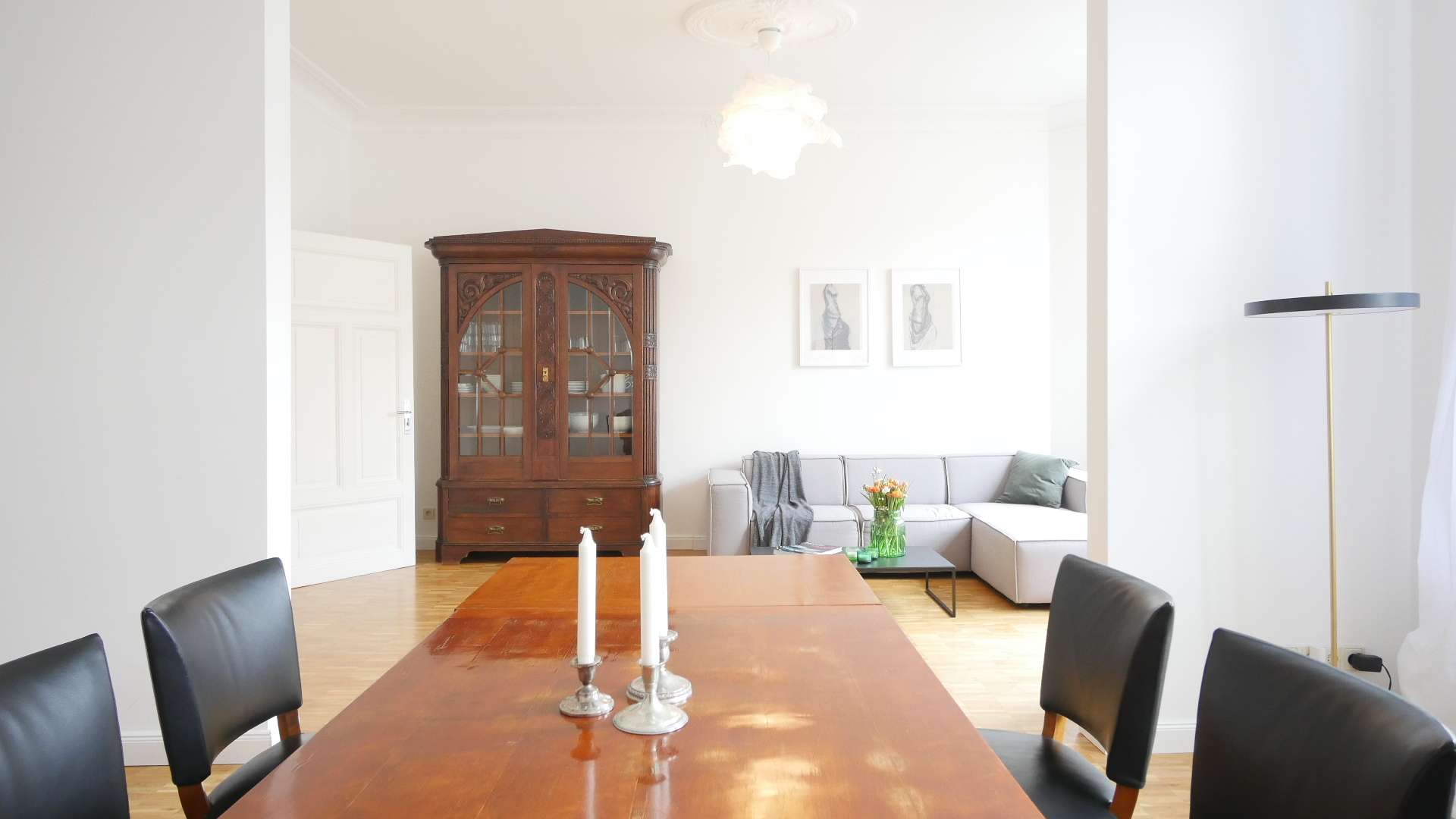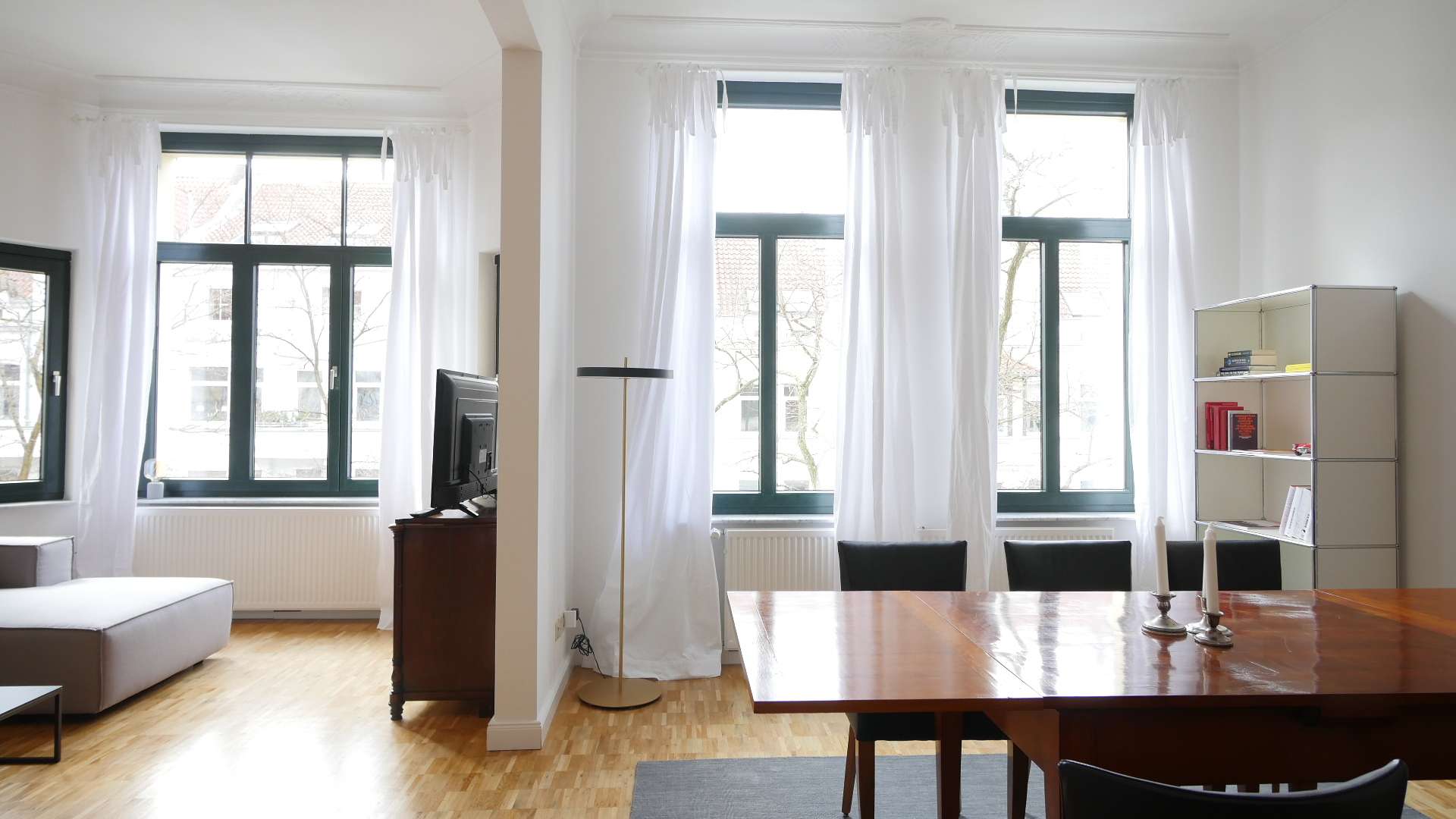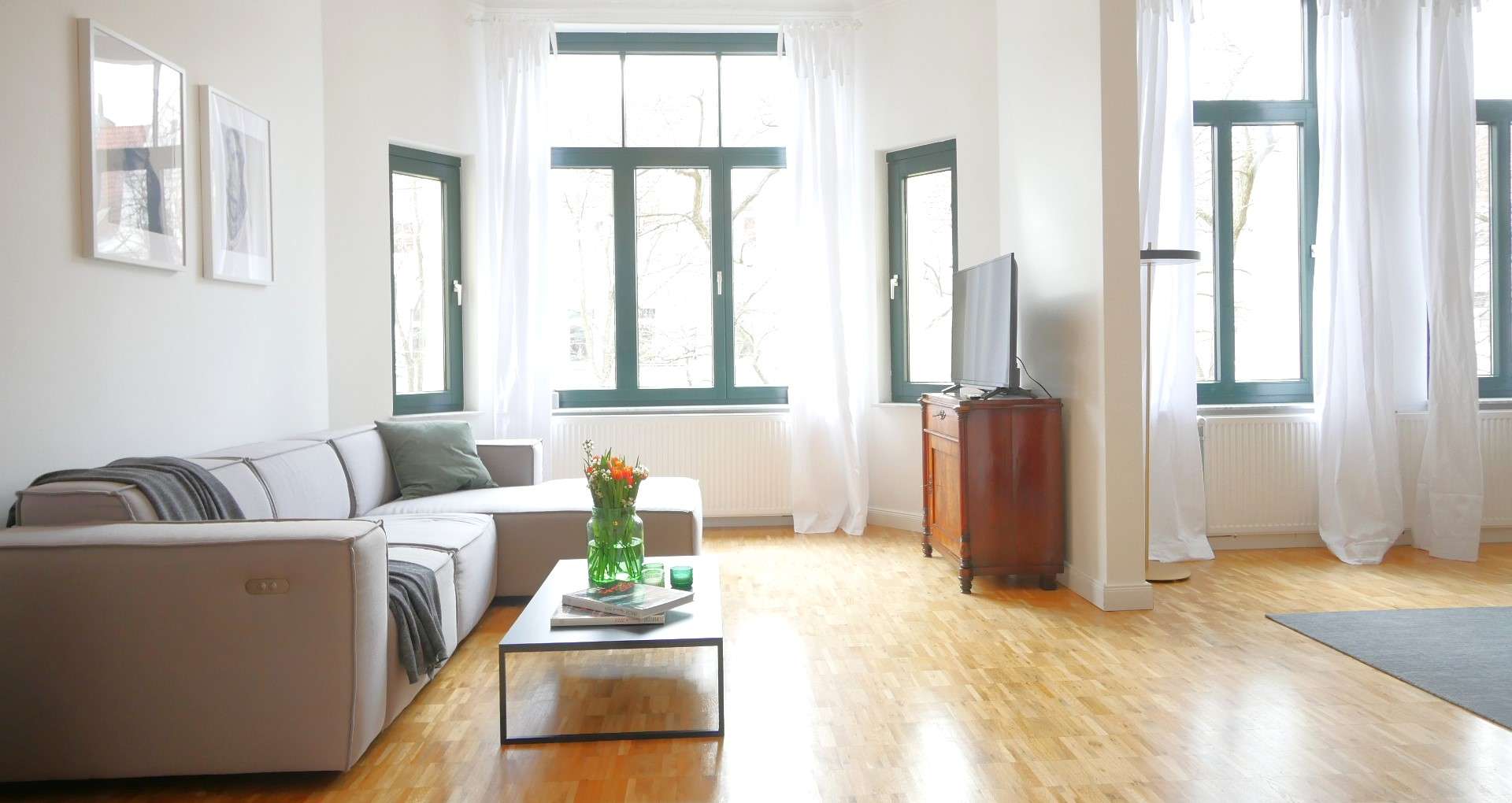 Der schicke Wohnbereich verfügt über eine große Vintage-Vitrine, ein graues Ecksofa mit Beistelltisch und ein Lowboard mit Flatscreen TV. Wände trennen teilweise den Essbereich ab. Hier befindet sich ein großer Esstisch mit 6 Stühlen, ein Vintage Holzschrank und ein Bücherregal. Das Wohn-/Esszimmer erscheint sehr hell und einladend durch große stilvolle Fenster mit dunkelgrünen Rahmen.