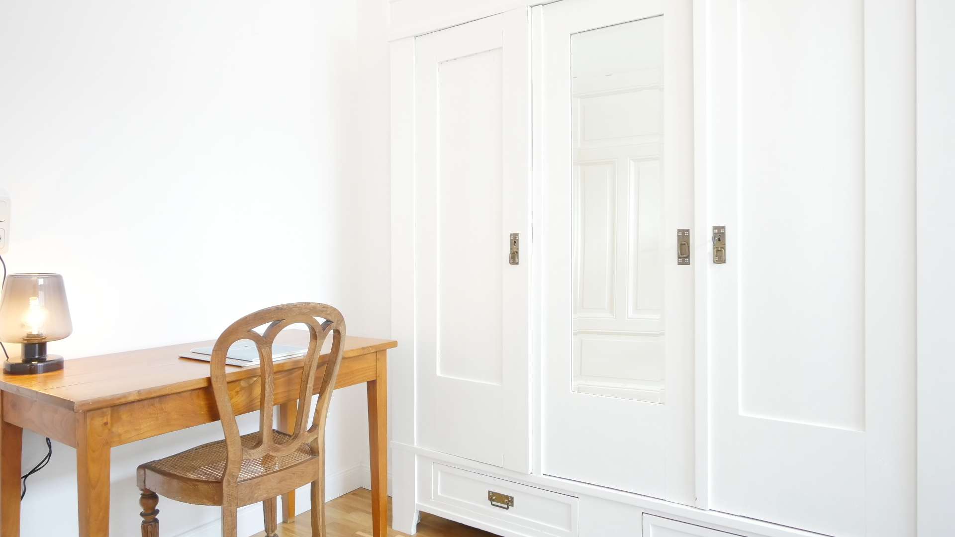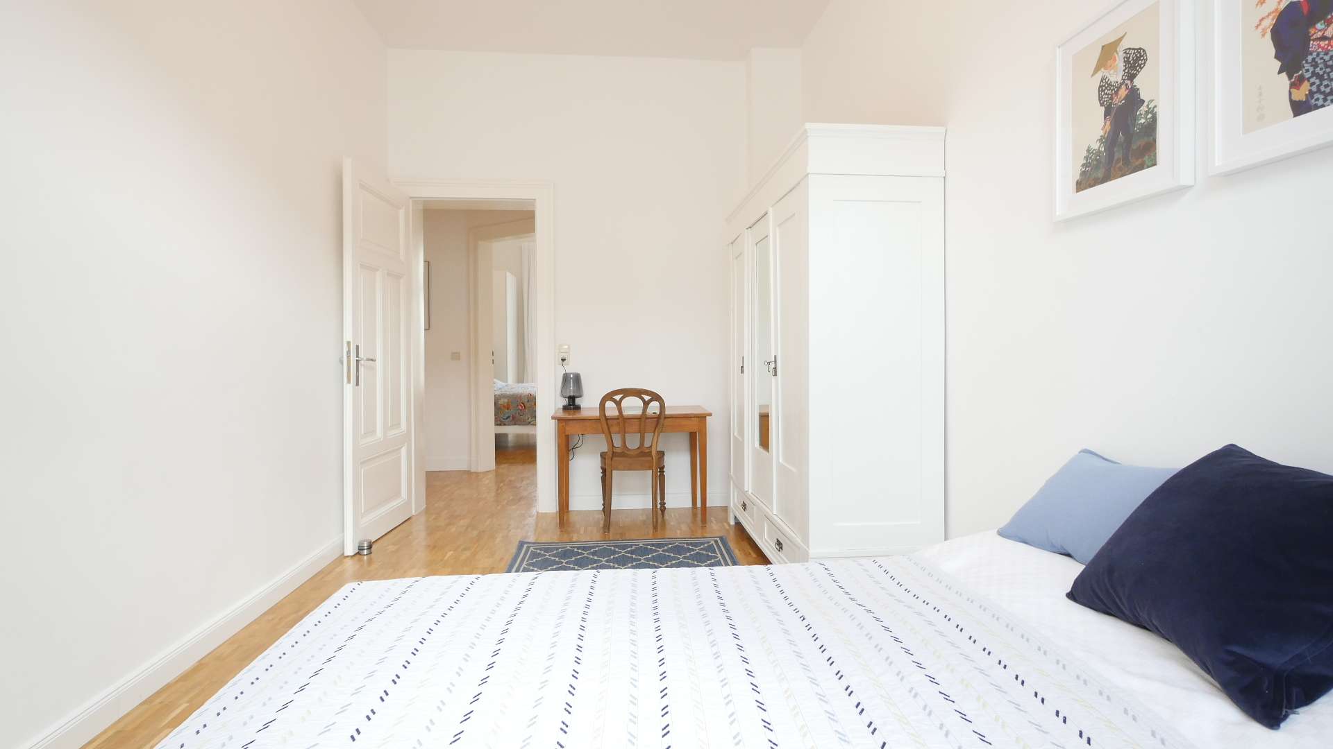 Das zweite Schlafzimmer ist ebenfalls mit einem Doppelbett, großen Kleiderschrank mit Ganzkörperspiegel sowie einem kleinen Schreibtisch mit Lampe ausgestattet.