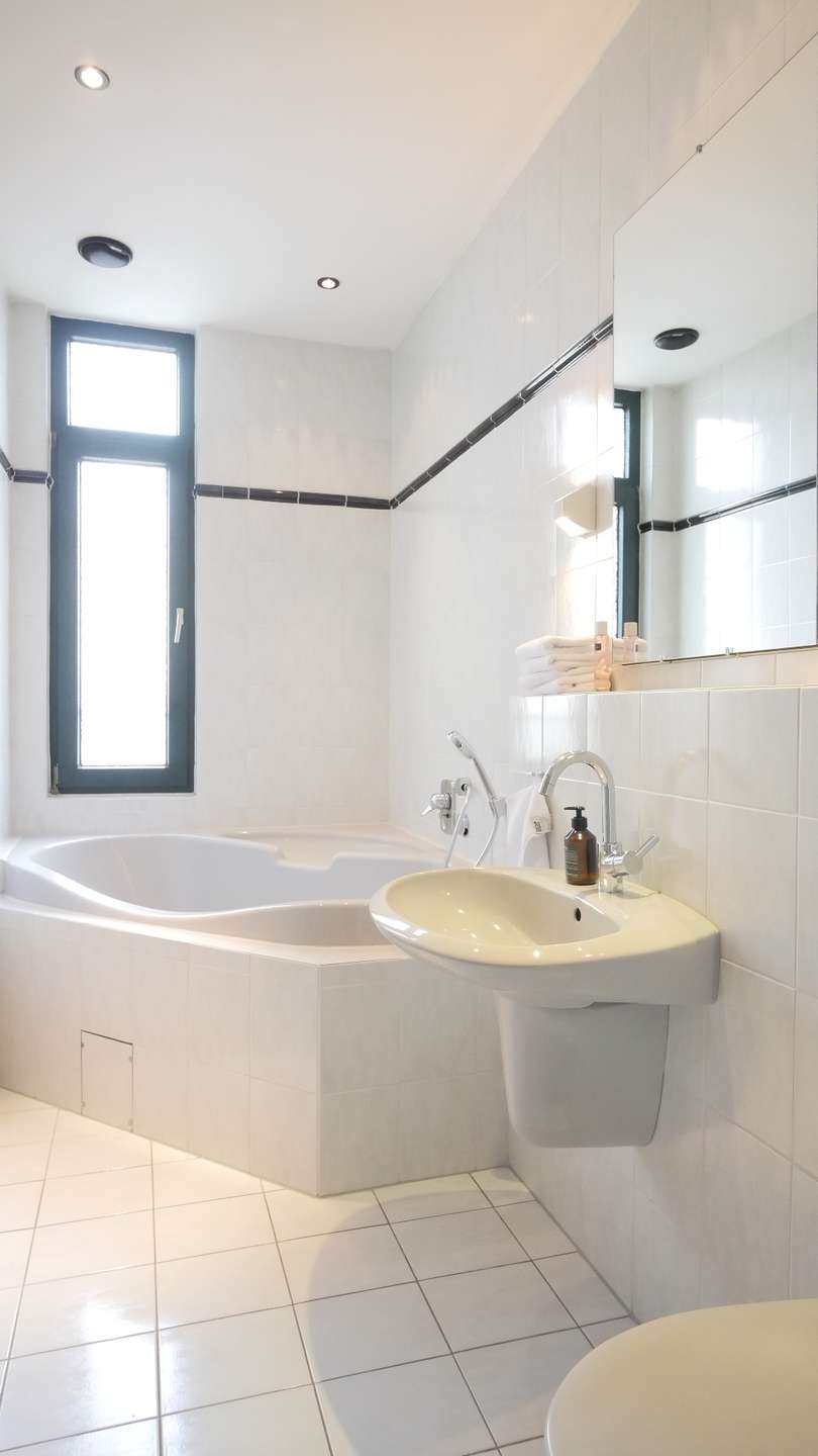 Das in weiß geflieste Badezimmer verfügt über eine Badewanne, WC und Waschbecken.