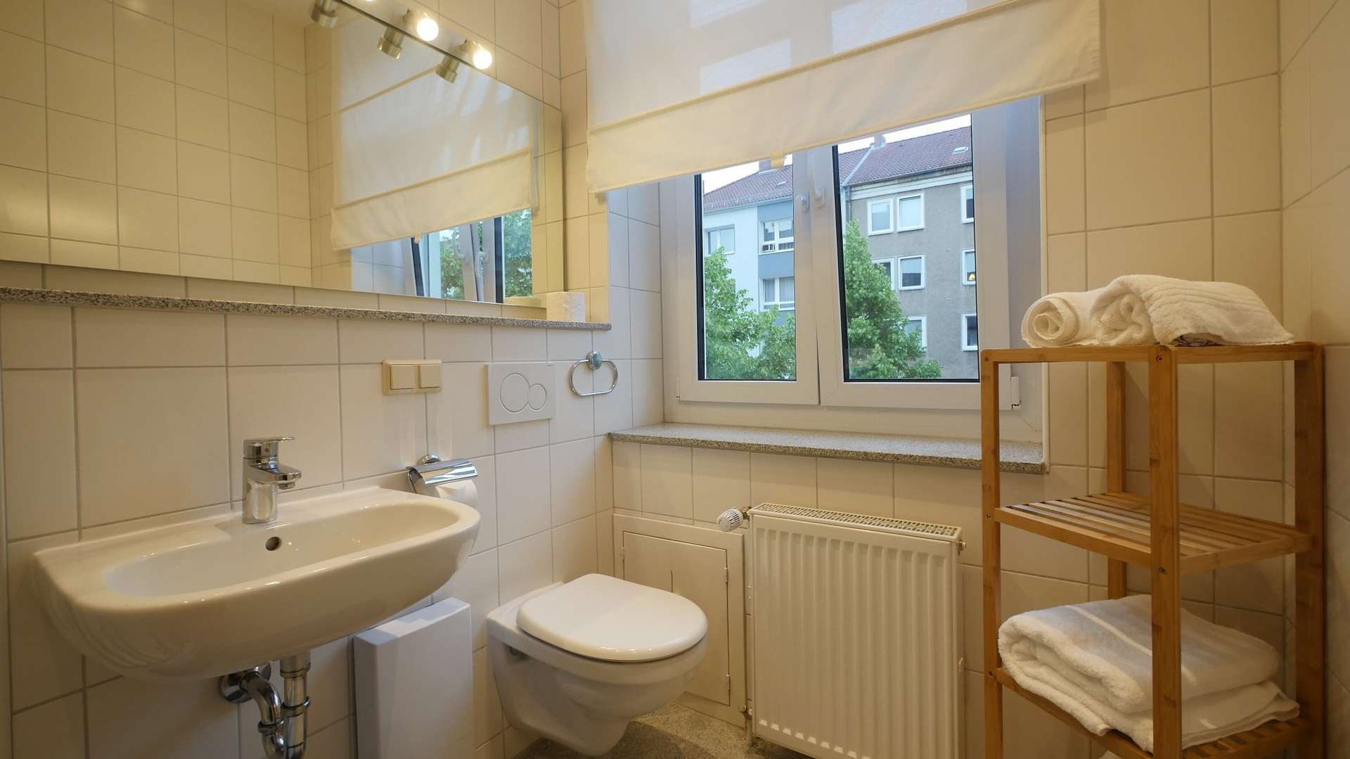 Das helle Tageslichtbad ist ausgestattet mit einer Dusche, Waschbecken und einem WC, weiße Fliesen.