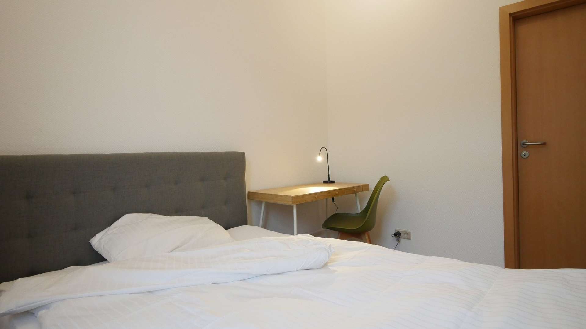Das Schlafzimmer ist mit einem 140cm breiten Doppelbett und einem Schreibtisch eingerichtet. Von hier ist der begehbare Kleiderschrank zugänglich.