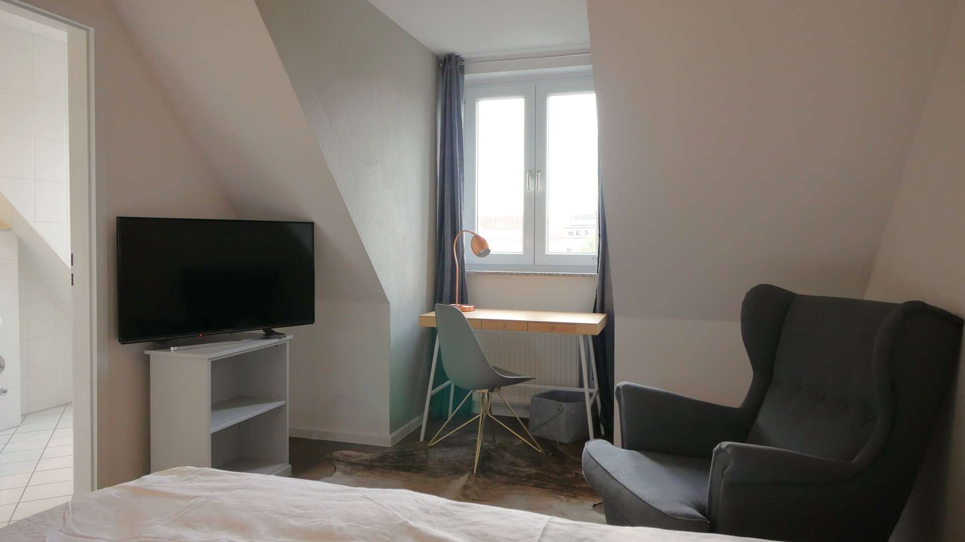 Im kombinierten Wohn-/Schlafzimmer befindet sich ein 140cm breites Doppelbett, ein Kleiderschrank, ein kleines Sofa mit Beistelltisch und ein Flachbild-TV.