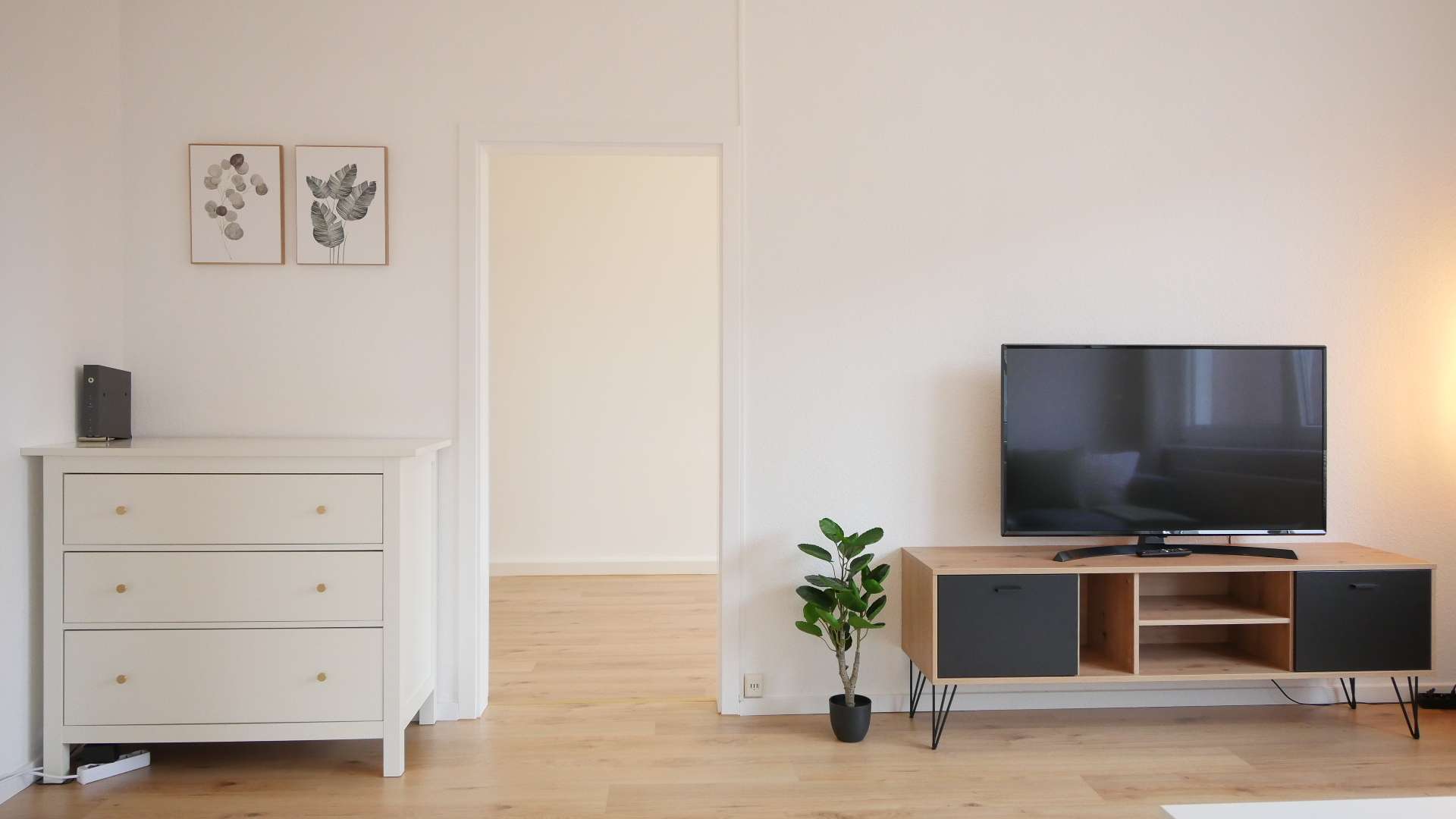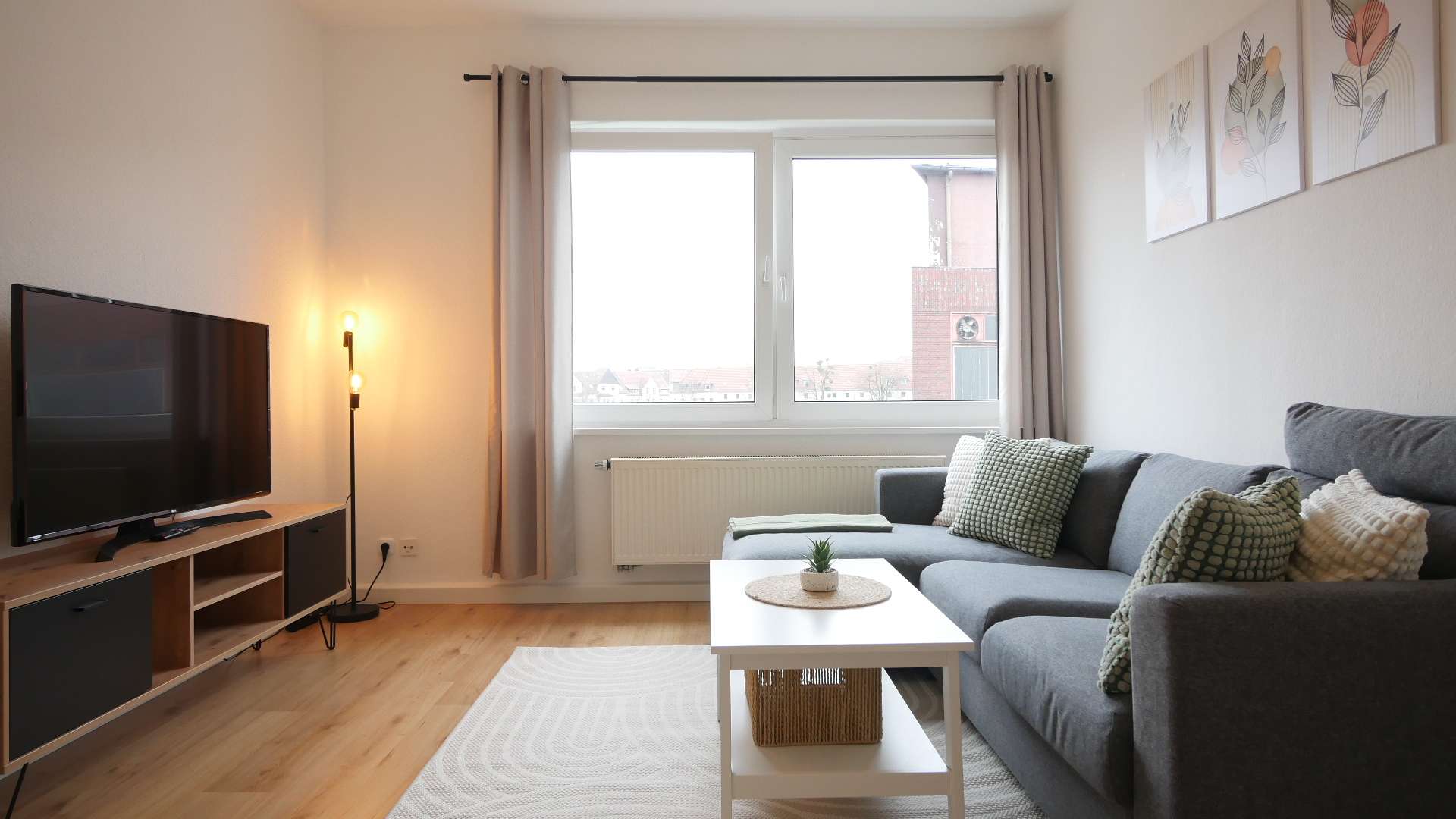 Das Wohnzimmer, direkt vom Flur aus erreichbar, lädt mit einem komfortablen grauen Ecksofa, einem Beistelltisch, einer stilvollen weißen Teppichfläche sowie einer modernen Kommode zum Verweilen ein. Ein Fernseher mit Unterschrank sorgt für Unterhaltung, während das große Fenster den Raum mit natürlichem Licht durchflutet.