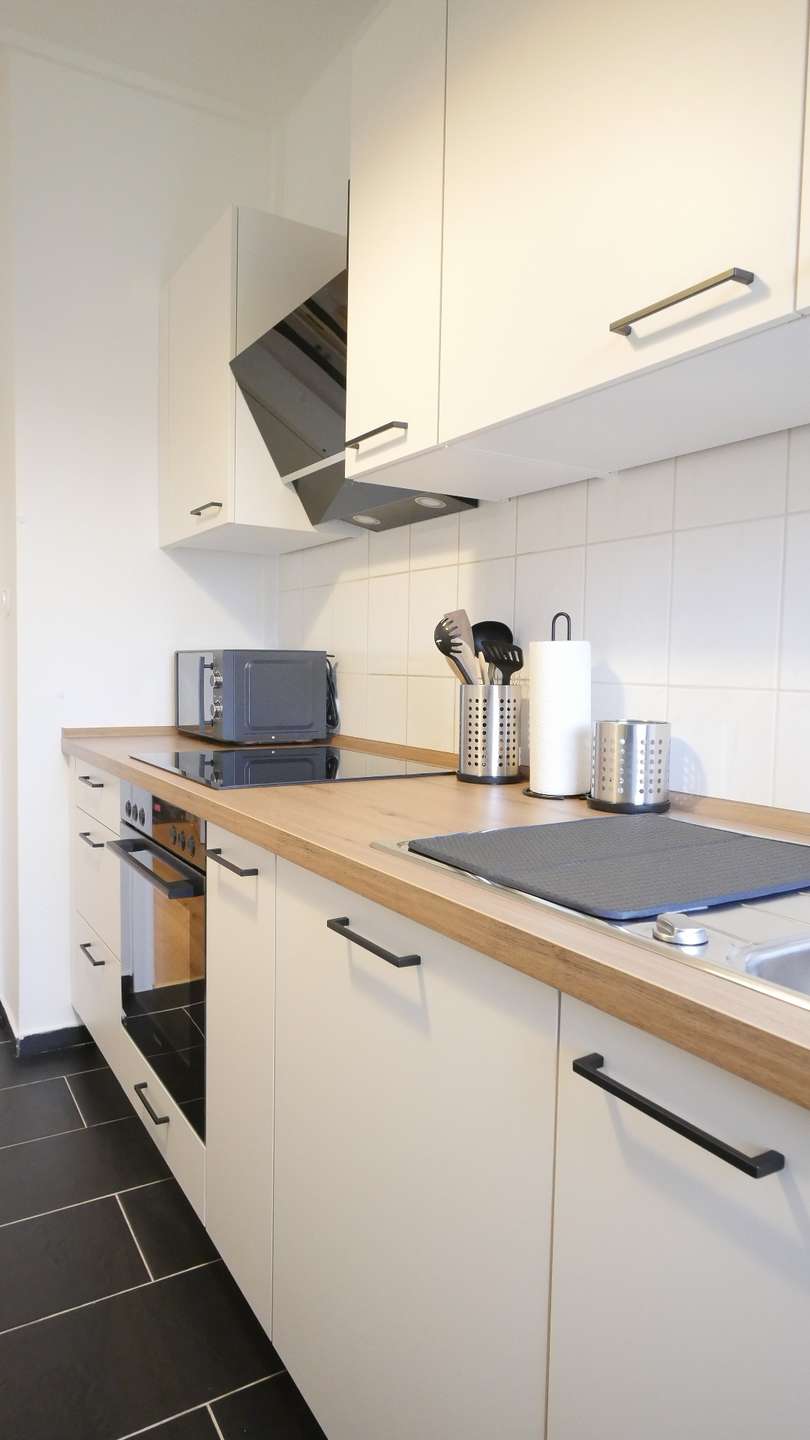 Im Zuge der Renovierung wurde eine brandneue Einbauküche installiert. Sie bietet großzügigen Stauraum für Küchenutensilien sowie eine hochwertige Ausstattung mit Spülmaschine, Dunstabzugshaube, Kühlschrank, Backofen, Herd und Waschmaschine. Ein Esstisch schafft einen gemütlichen Platz für Mahlzeiten.