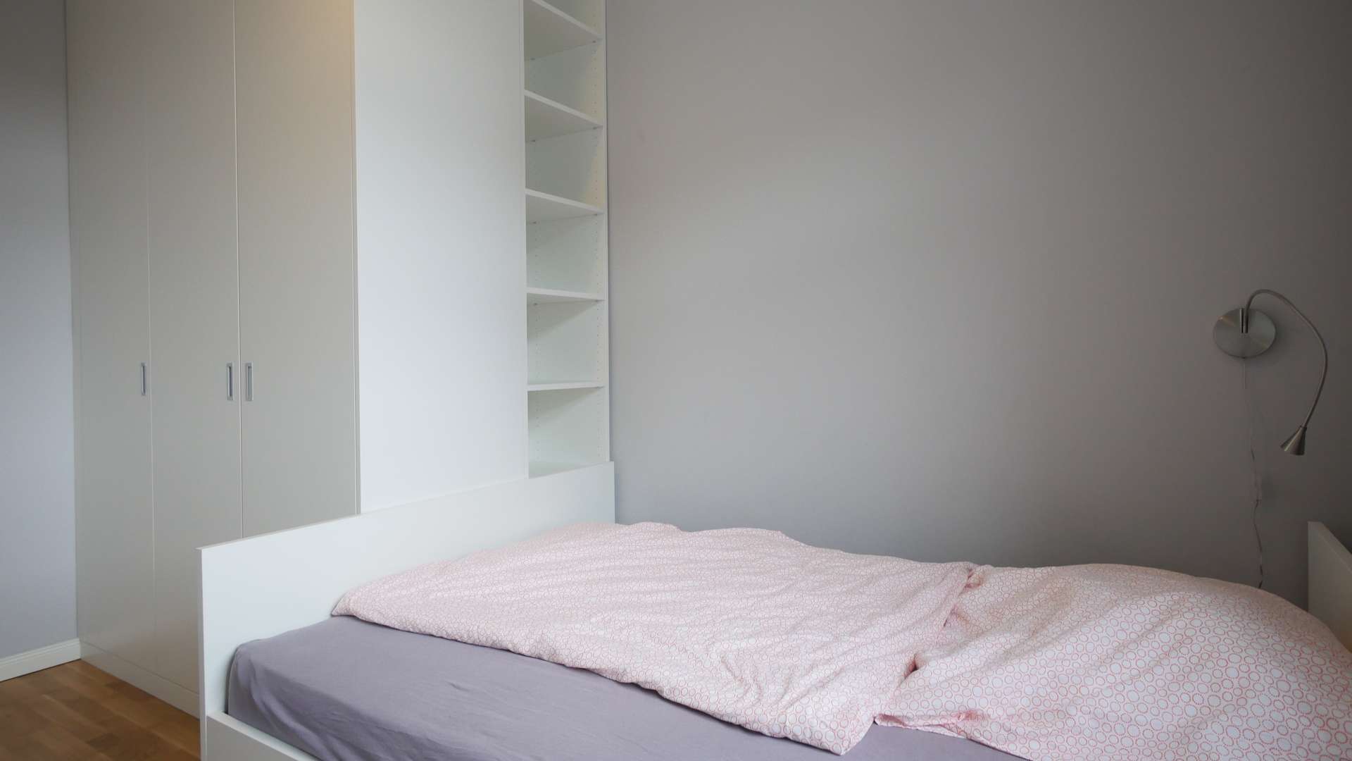 Im Schlafzimmer sind hochwertige, vom Tischler maßangefertigte Kleiderschränke sowie ein ebenfalls maßangefertigtes Bett vorhanden.