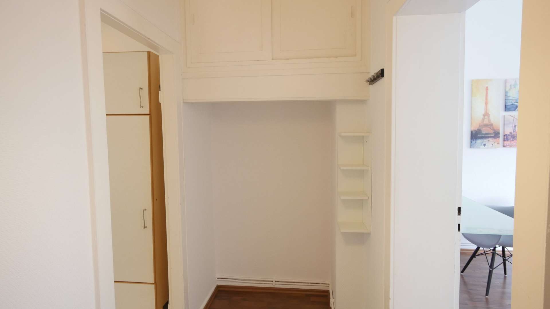 Im Flur befindet sich eine Garderobennische sowie ein unter der Decke angebrachter Abstellraum mit Schiebetüren.