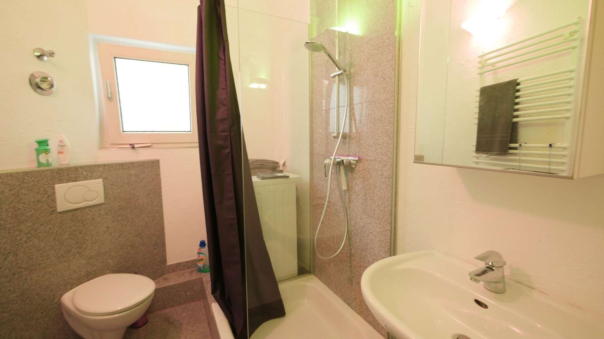 Das helle Badezimmer mit Fenster verfügt über Dusche, wandhängendes WC und Waschbecken. Hier befindet sich auch die Waschmaschine.