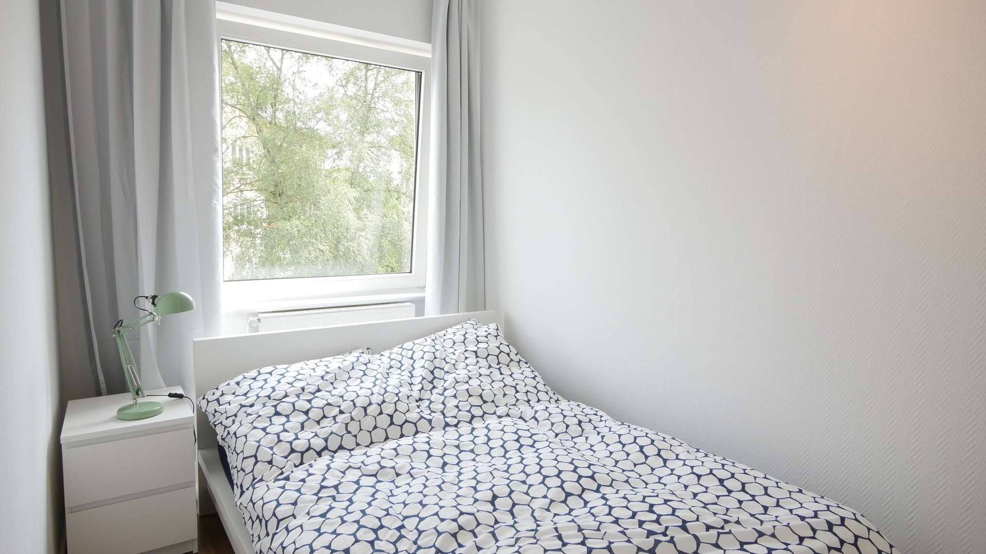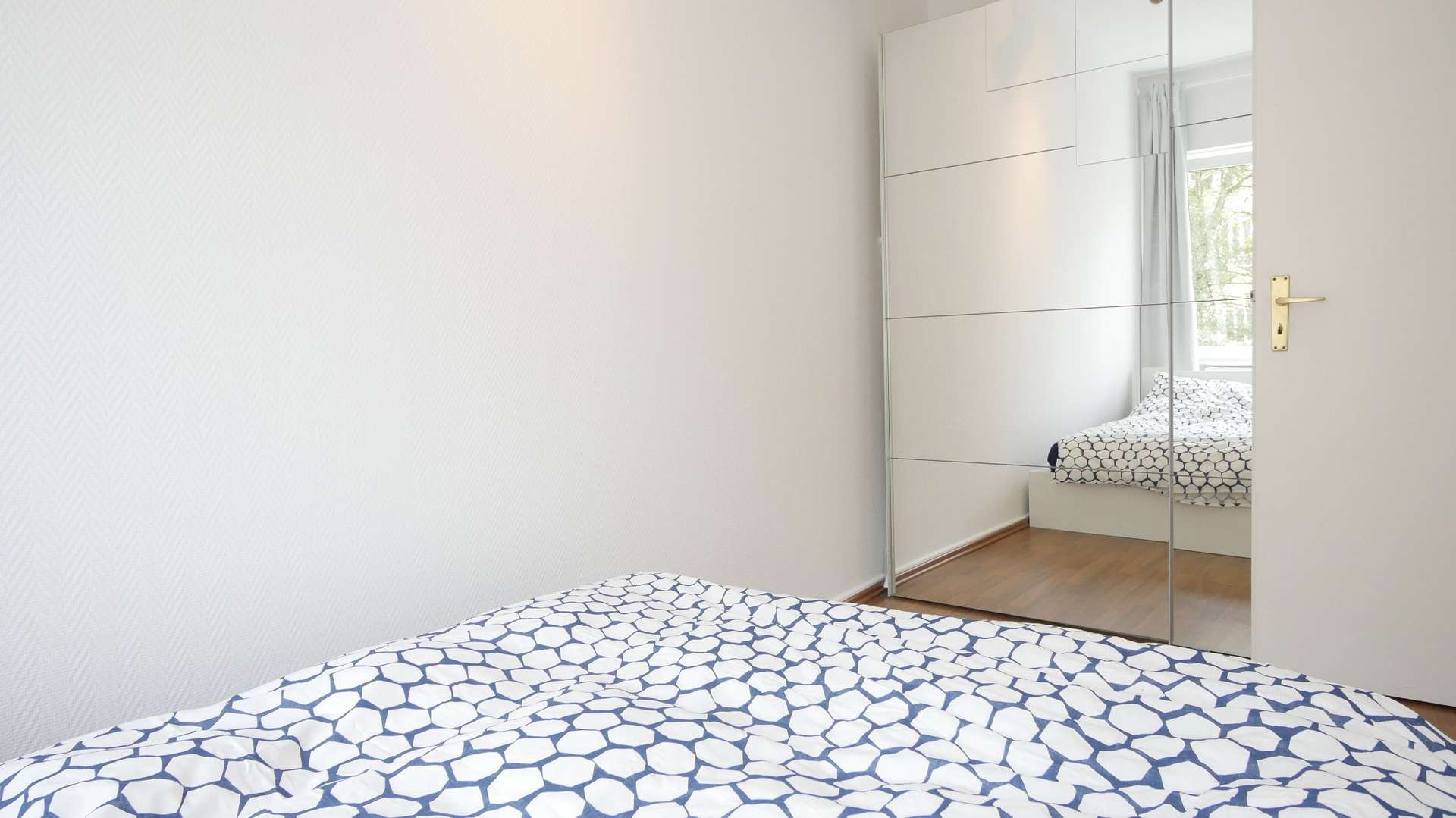 Im Schlafzimmer befindet sich ein Doppelbett (140×200 cm), Nachttisch und Kleiderschrank mit Spiegeltüren.