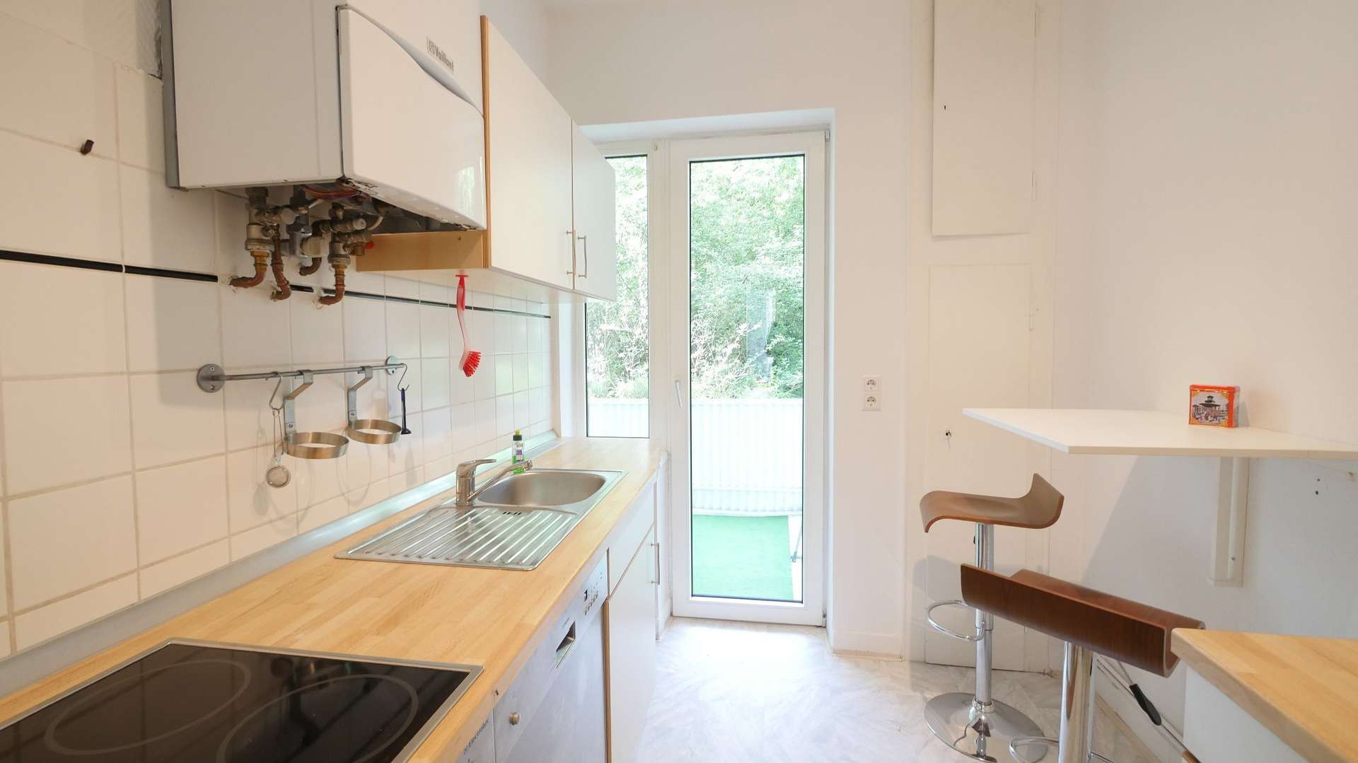Von der Einbauküche hat man Zugang zum Balkon mit Blick in den grünen Innenhof. Die Küche ist ausgestattet mit Backofen, Cerankochfeld, Kühl-/Gefrierkombi und Geschirrspüler.