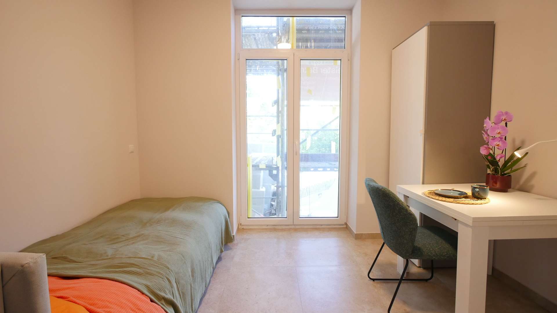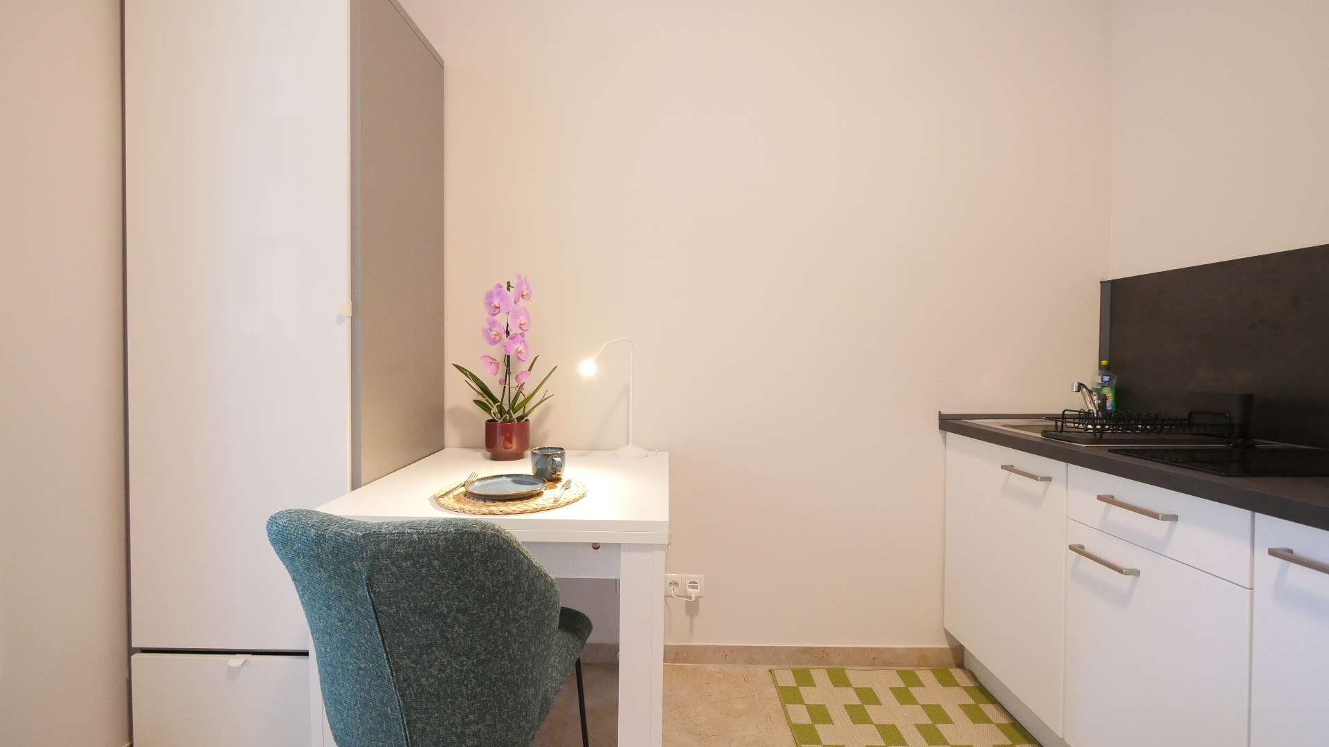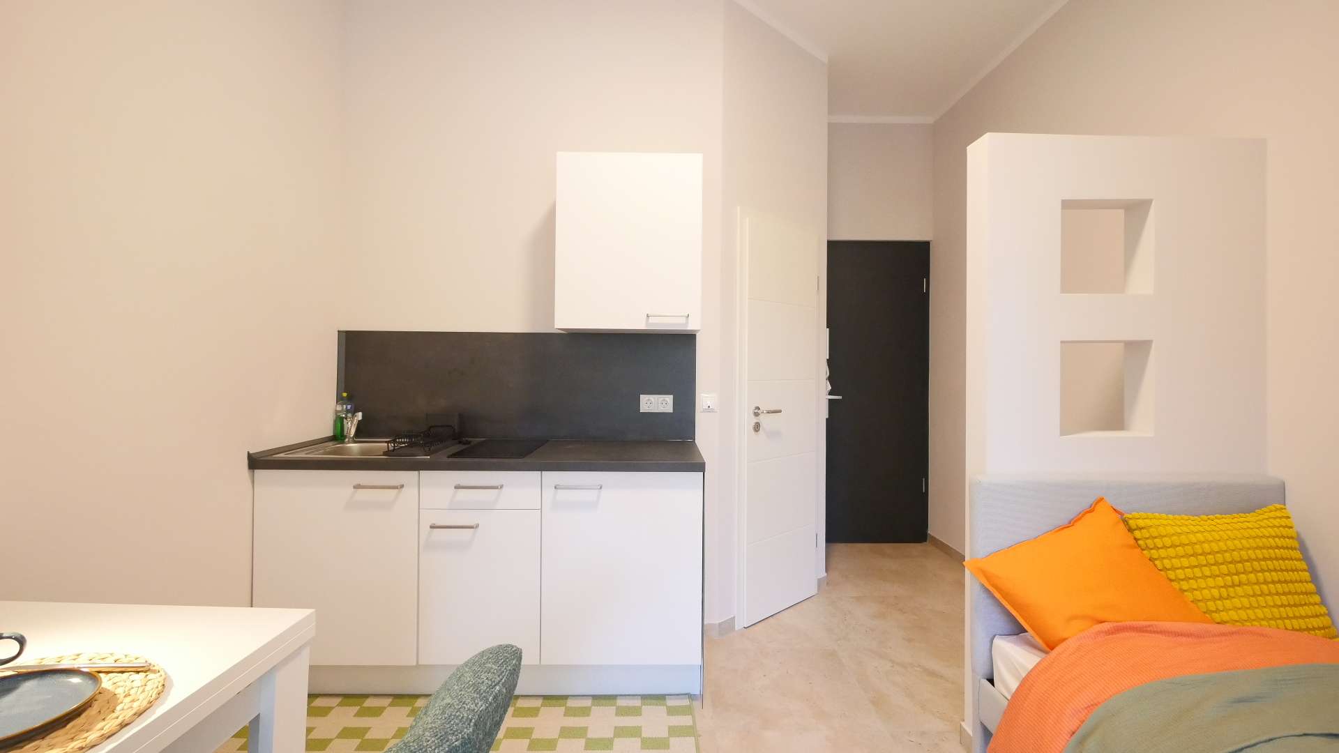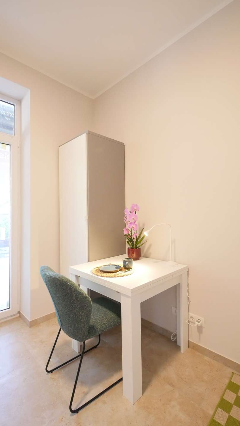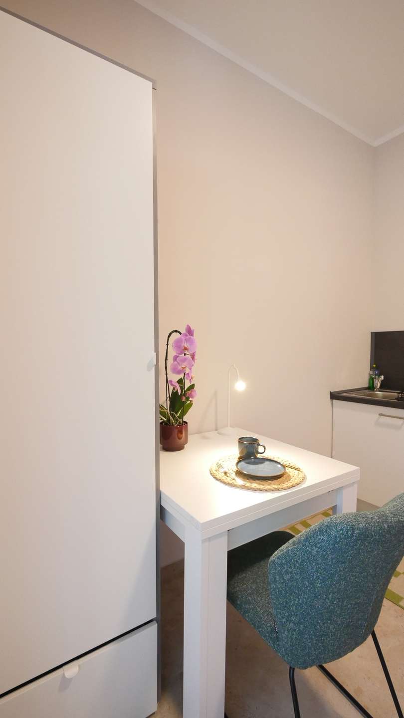 Der Wohn- und Schlafbereich ist stilvoll möbliert und bietet alles für den sofortigen Einzug: Ein komfortables Einzelbett, einen Esstisch mit Stuhl sowie einen praktischen Kleiderschrank. Ein Flachbildschirm-TV wird in Kürze ergänzt (auf den Bildern noch nicht zu sehen).