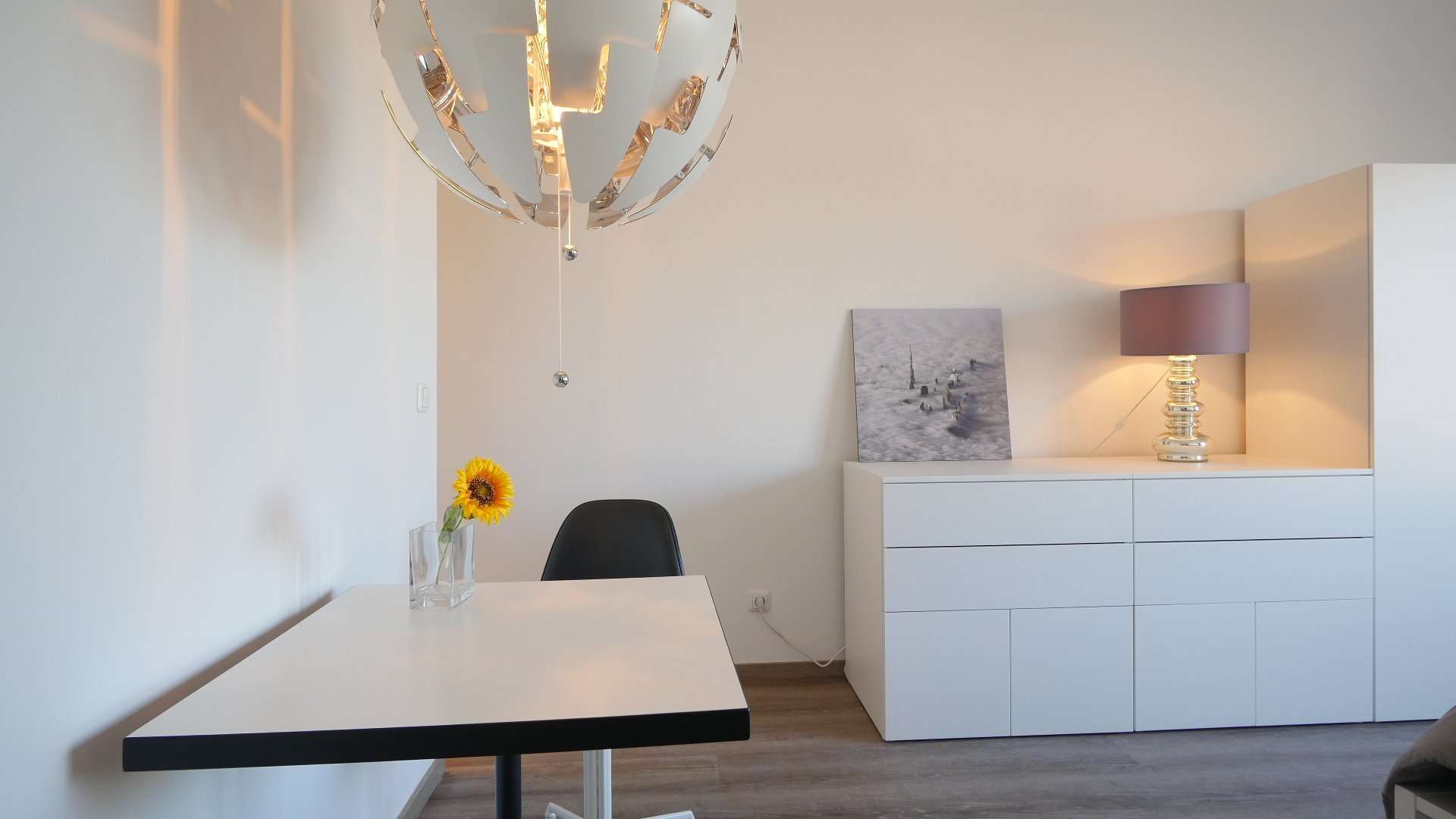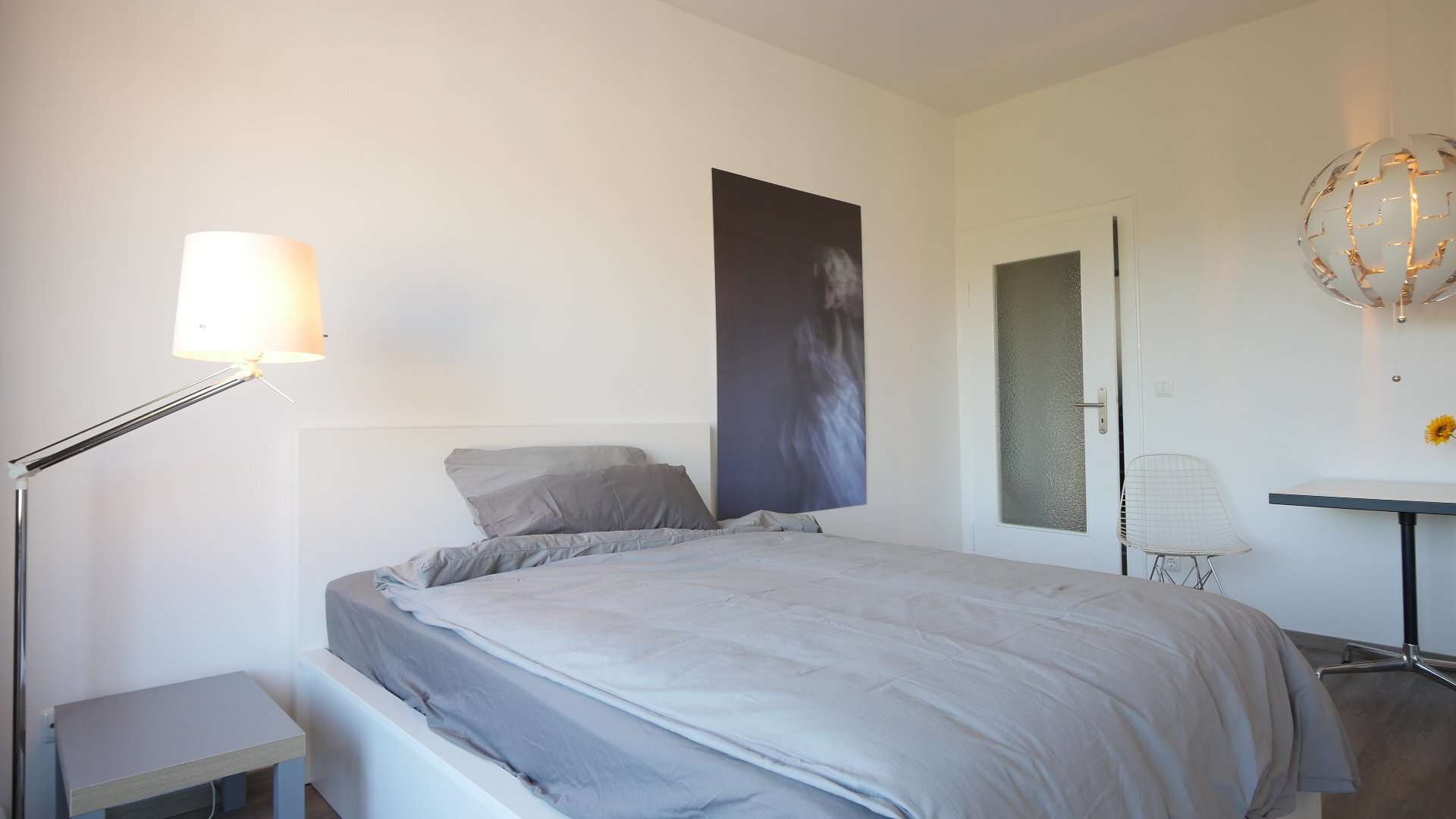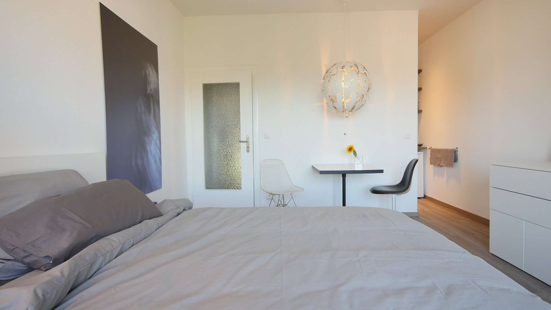 Im kombinierten Wohn-/Schlafzimmer befindet sich ein 140cm breites Bett, ein weiße Wohnwand, ein Designer-Sessel und ein Bistrotisch mit zwei Stühlen.
