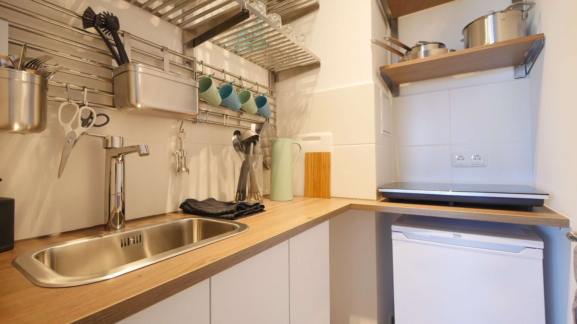 Die Pantryküche ist ausgestattet mit einem 2-Platten-Induktionskochfeld, einer Kühl-/Gefrierkombination, einer Spüle sowie sämtlichem Küchenequipment.