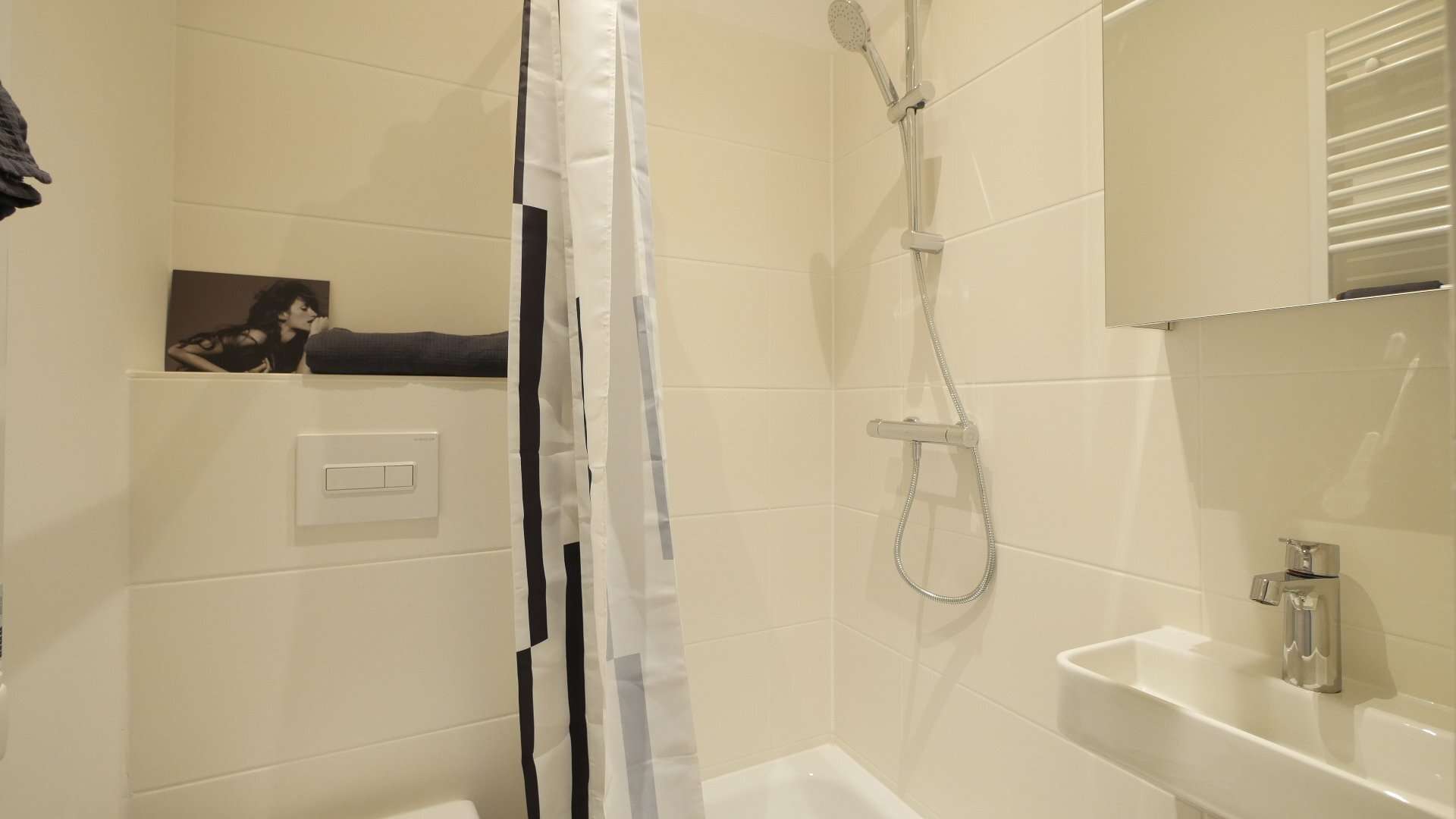 Das Badezimmer ist ausgestattet mit Dusche, Waschbecken und WC. Internet vorhanden. Eine Waschmaschine befindet sich im 5.OG.