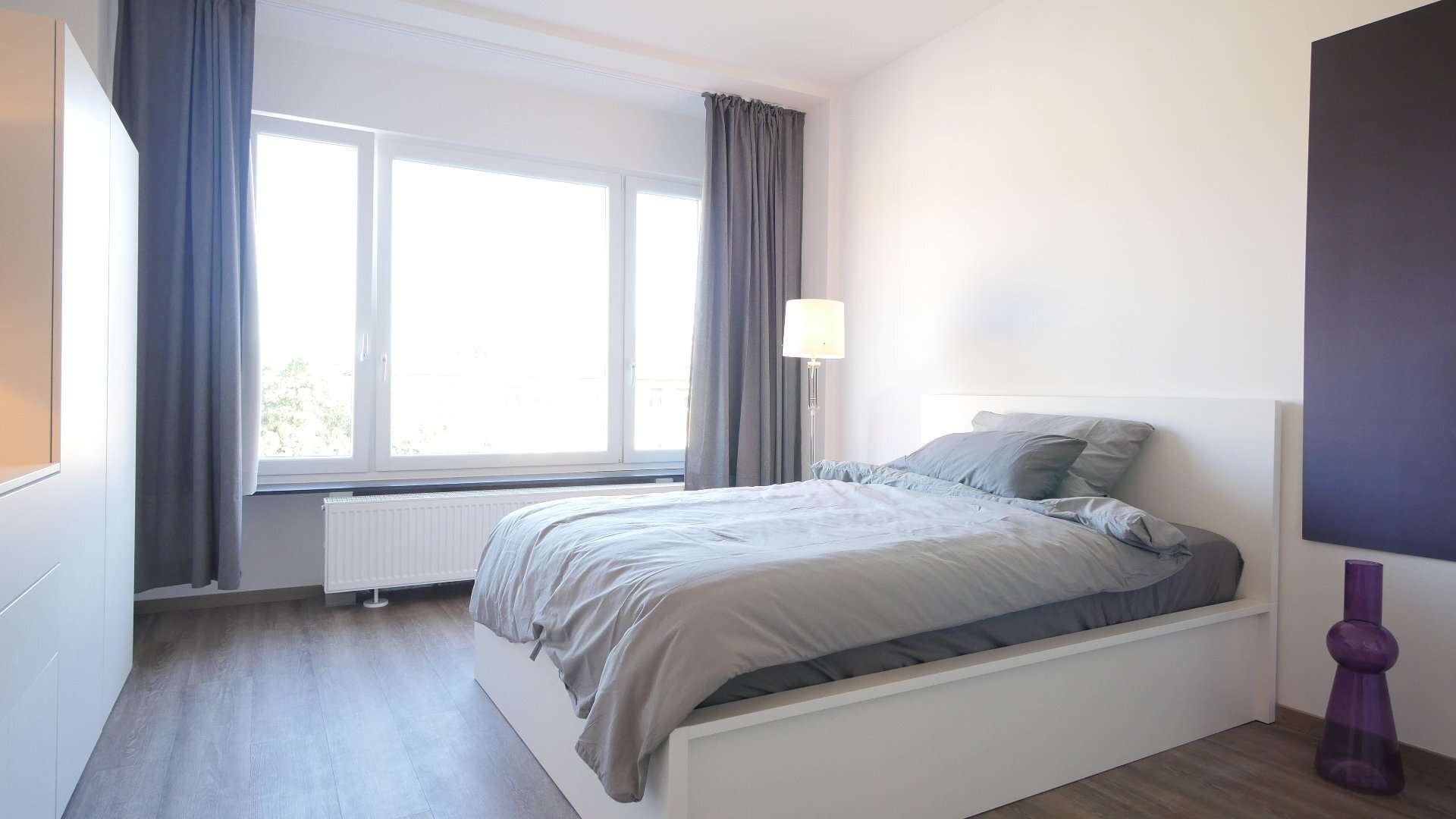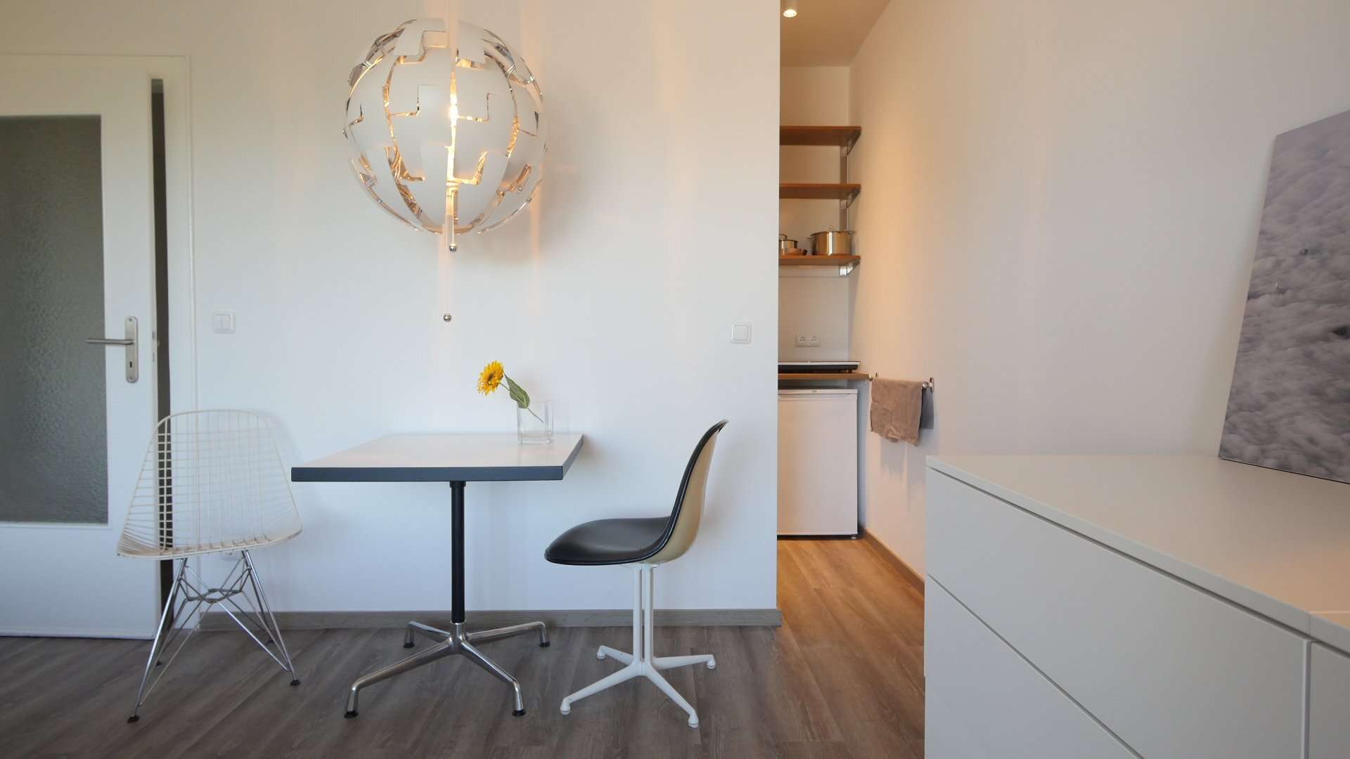 Im kombinierten Wohn-/Schlafzimmer befindet sich ein 140cm breites Bett, ein weiße Wohnwand, ein Designer-Sessel und ein Bistrotisch mit zwei Stühlen.