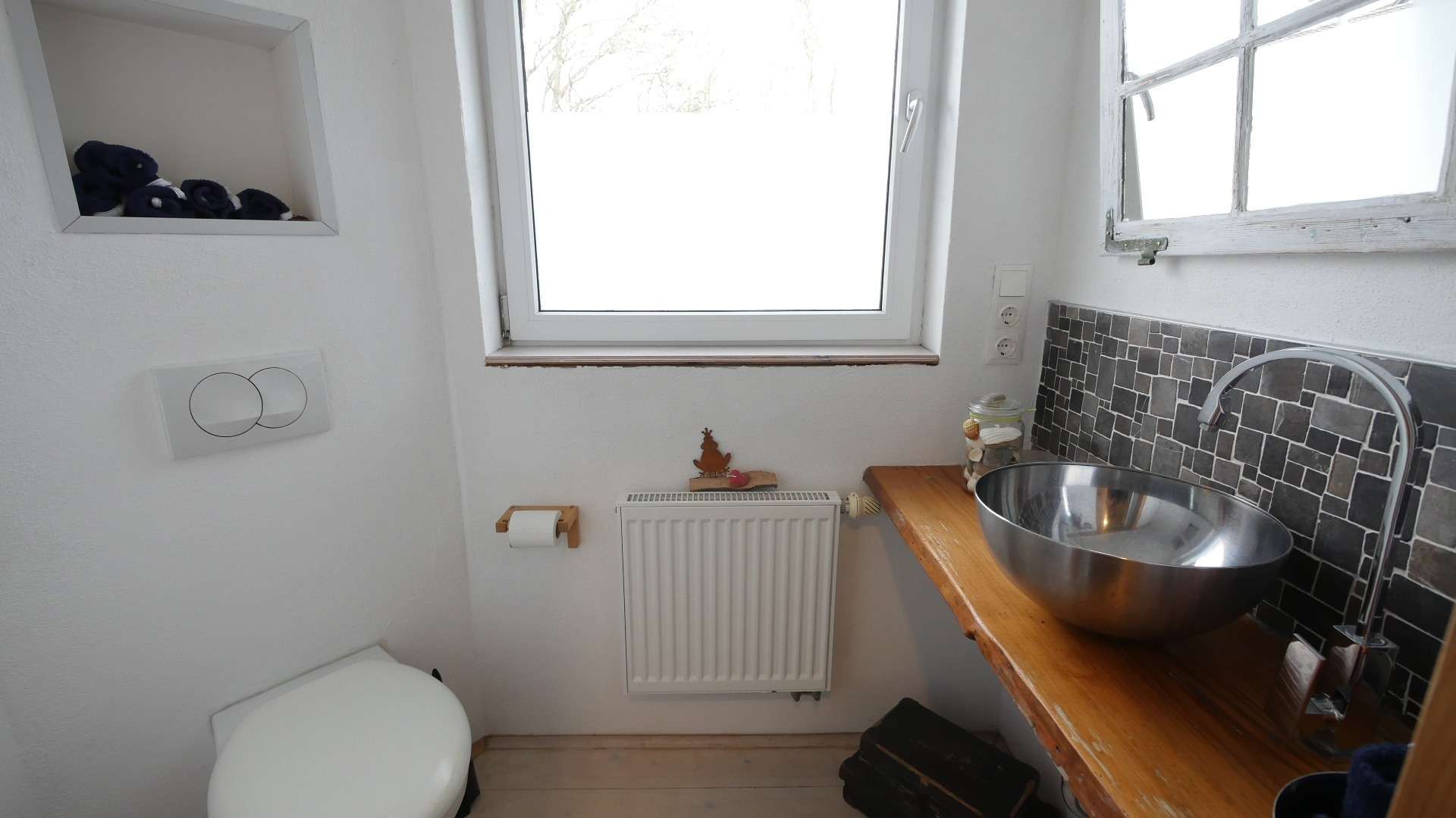 Das Haus verfügt ebenfalls über ein Gäste WC mit einer Toilette, Waschbecken, Spiegel sowie einem Fenster.