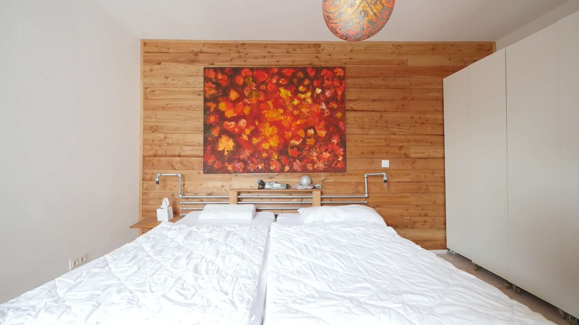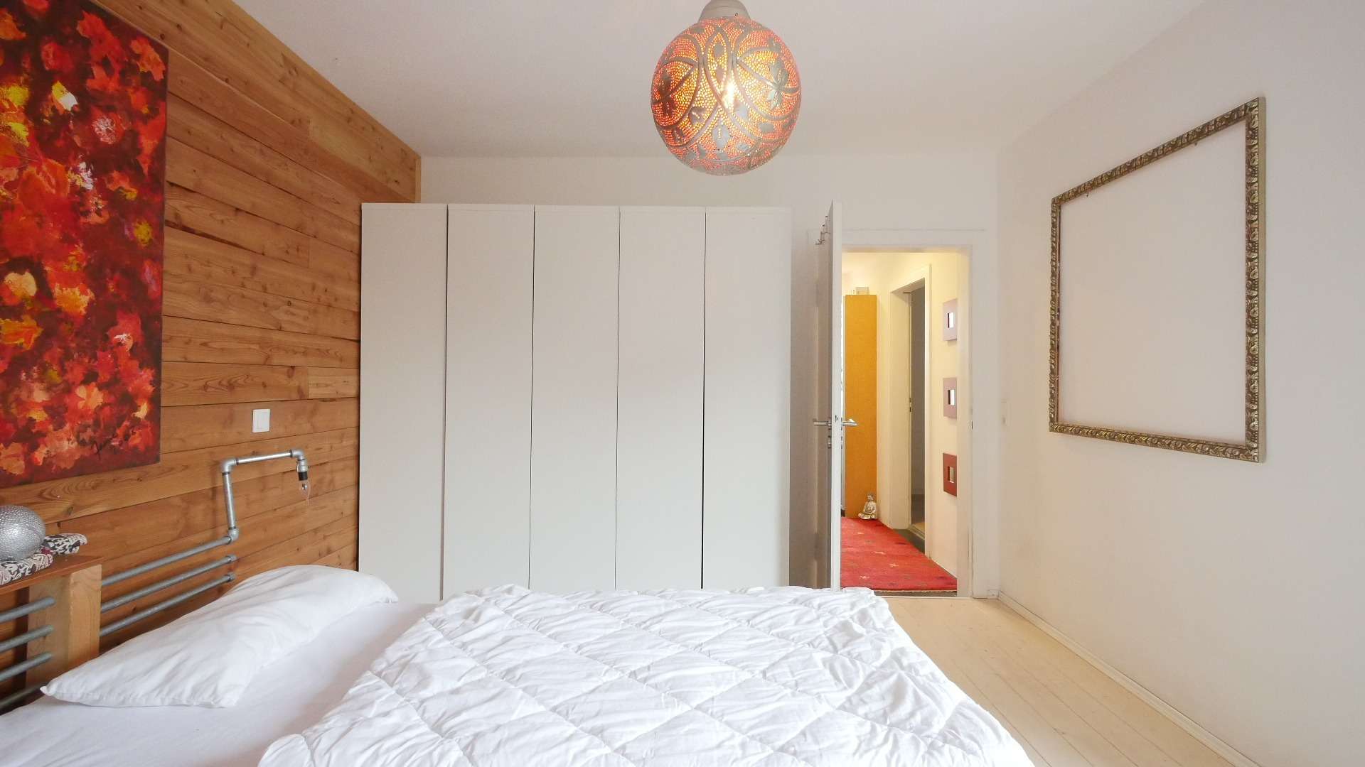 Das Schlafzimmer ist möbliert mit einem großen Doppelbett, einem Kleiderschrank, Kommode, Deckenleuchte sowie einem Tageslichtfenster.
