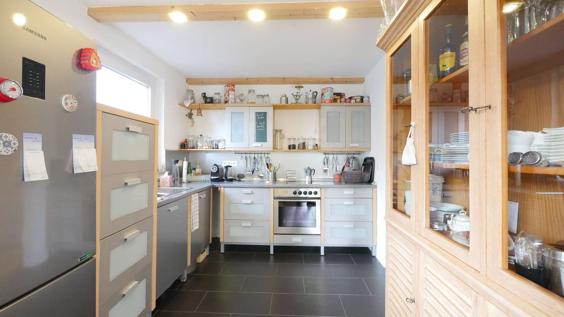 Die moderne Einbauküche verfügt über ausreichend Stauraum und alle notwendigen Küchenutensilien sowie LED Deckenbeleuchtung. Zur Verfügung stehen ein Induktionsherd, eine Dunstabzugshaube, ein Backofen, ein Kühlschrank, sowie eine Geschirrspülmaschine.