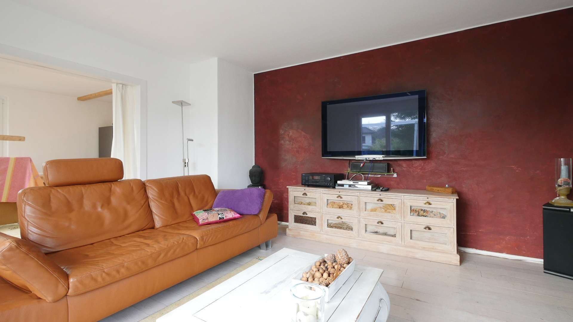 Das offen gestaltete Wohnzimmer ist ausgestattet mit einem Ledersofa, Stehlampe, Beistelltisch, Kommode, sowie einem Fernseher.