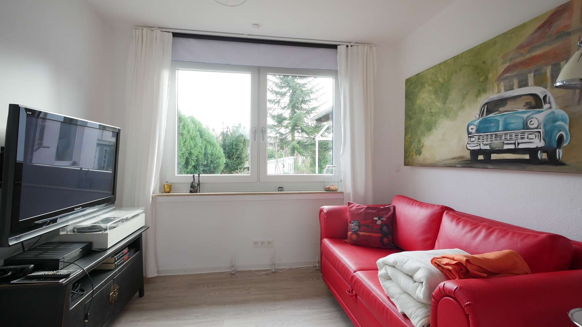 Ein Gästezimmer ist ebenfalls nutzbar, hier steht ein weiteres Ledersofa mit Schlaffunktion, sowie ein Fernseher.