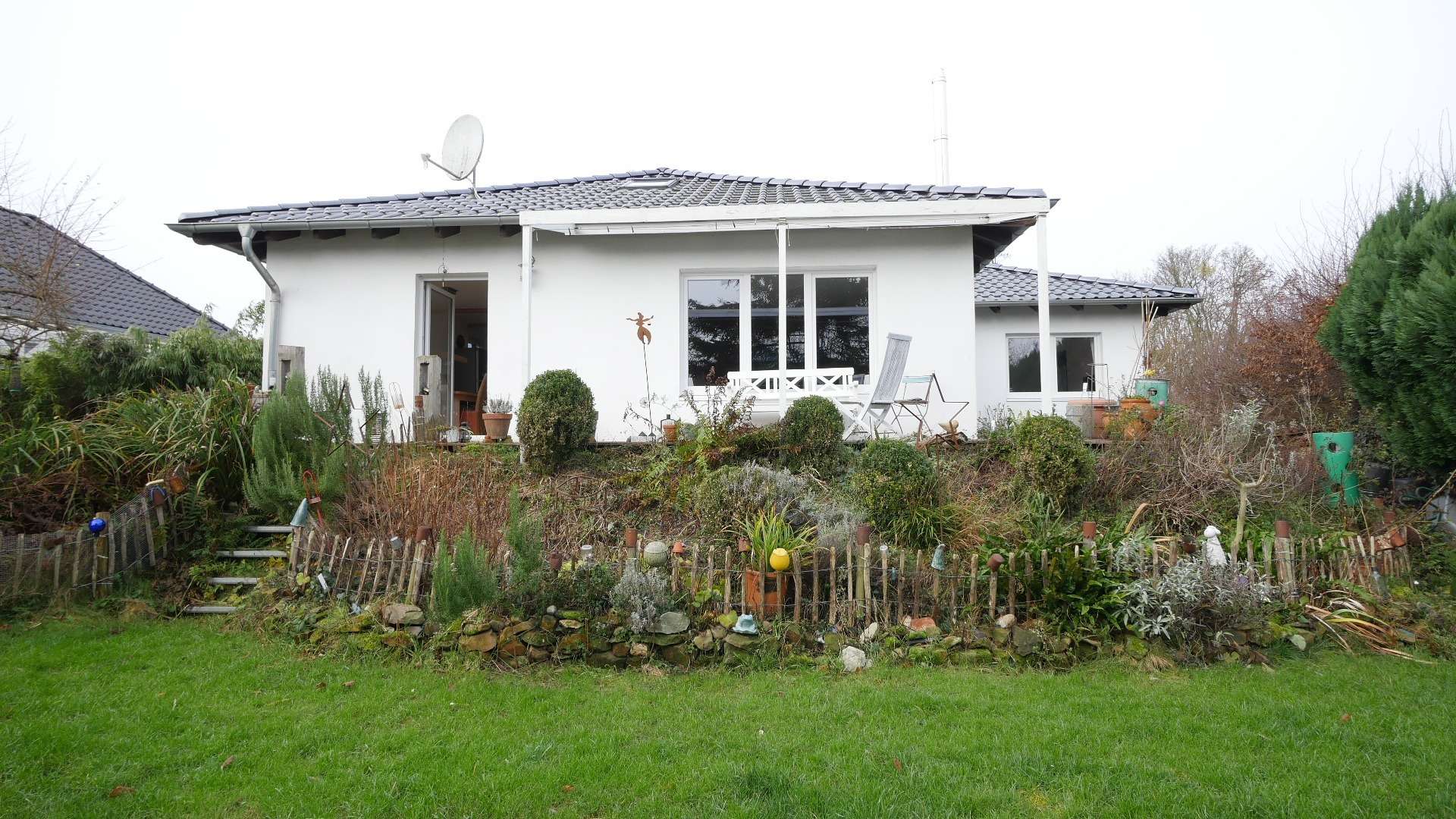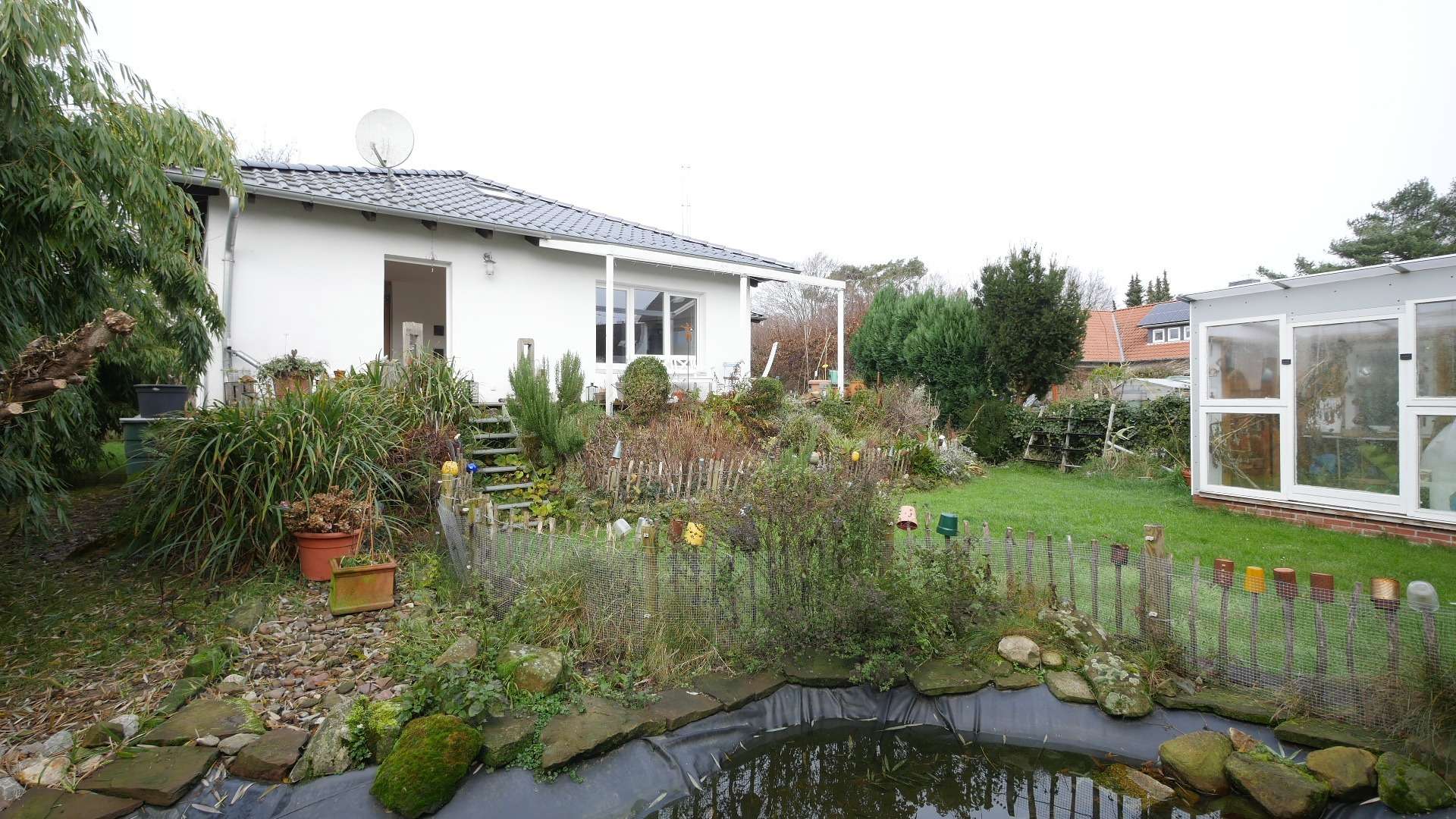 Ein großer Garten mit einem kleinen Teich und einem Gewächshaus, sowie Zugang zu einer unter dem Haus gelegenen Garage ist vorhanden.