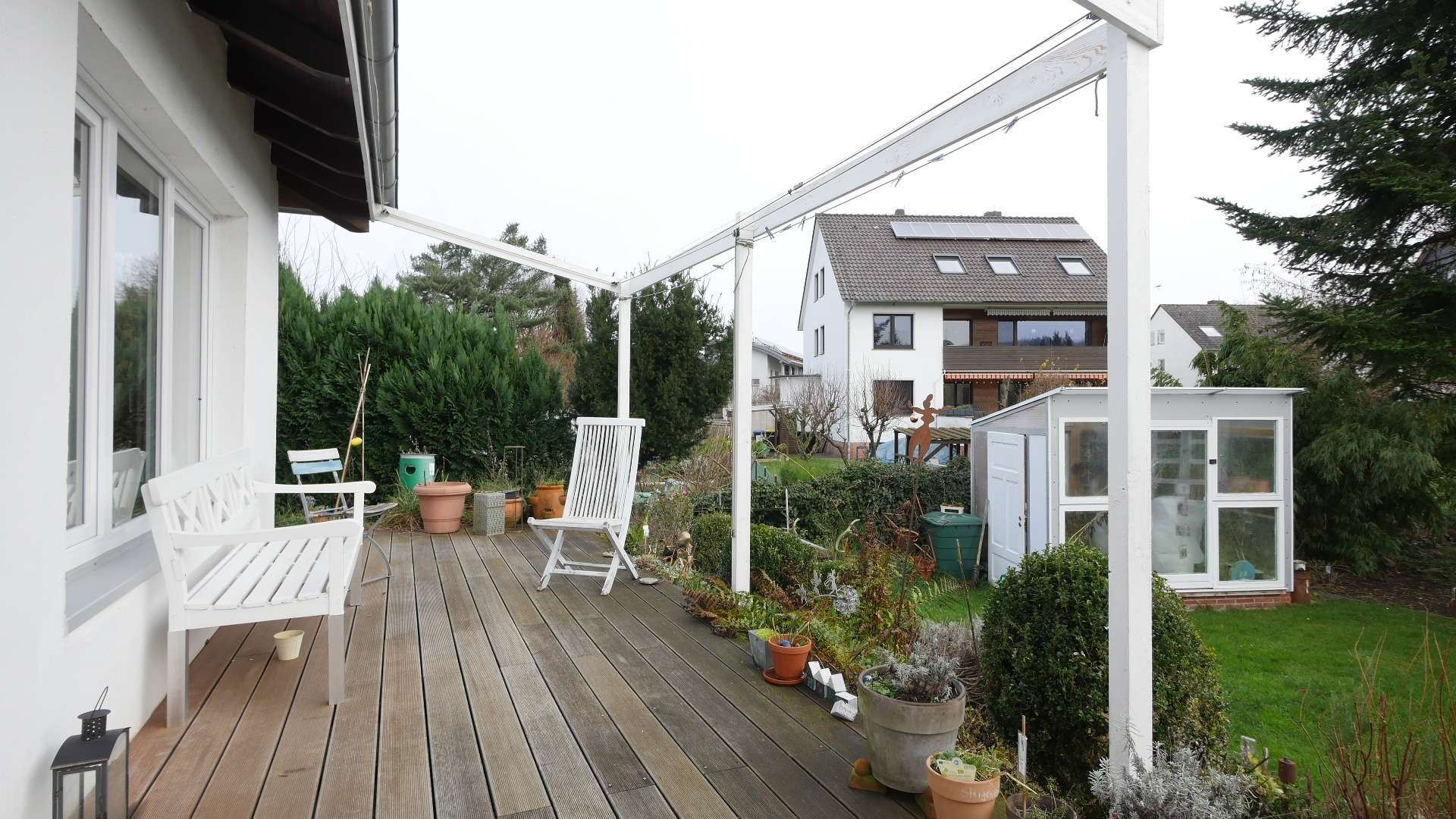 Highlight des Hauses ist die große holzverkleidete Terrasse mit integriertem Sonnenschutz. Die Möglichkeit einen Grill aufzustellen und den Abend ausklingen zu lassen ist ebenso gegeben.